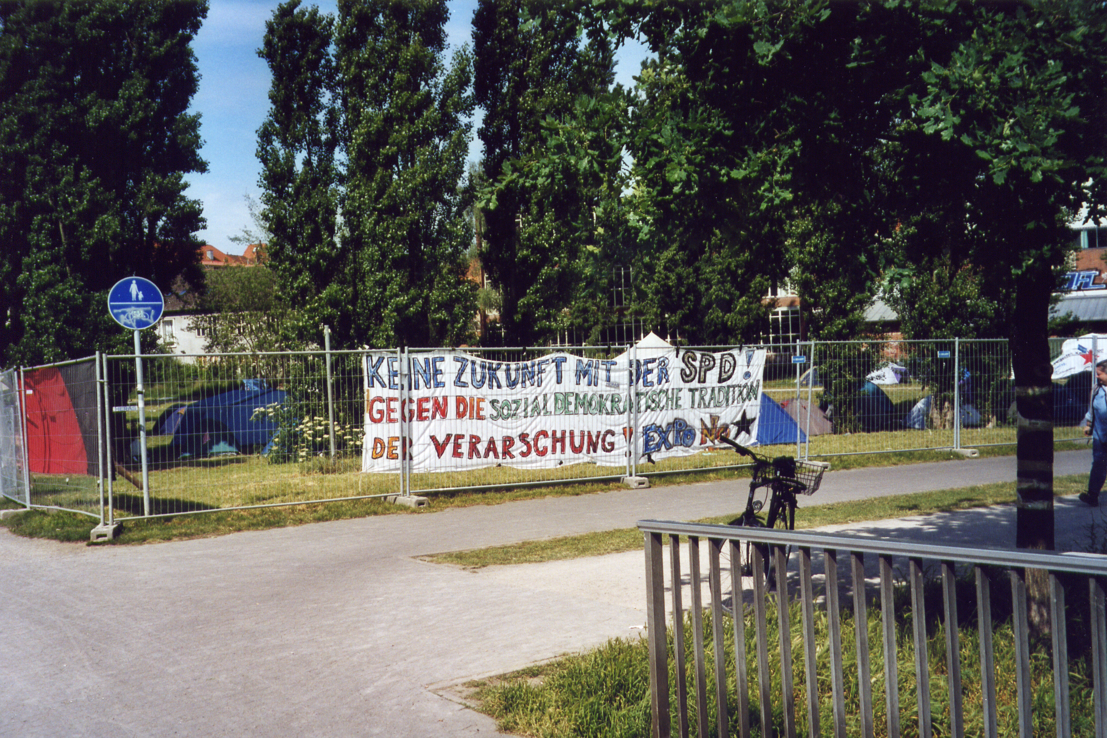 Natürlich gab es auch die notorischen Radaubrüder und Schwestern, die getreu dem Motto von Marx (Groucho) „Whatever it is, I am against it“ auch gegen die EXPO waren. Wobei das SPD-Verarschungs-Transpi zeitlose Gültigkeit hat. Das hätte man von 1914, der Zustimmung der SPD im Reichstag zu den Kriegskrediten, bis Heute, der Zustimmung der SPD zu jeder Schweinerei, über fast jede Periode der Sozialdemokratie hängen können.