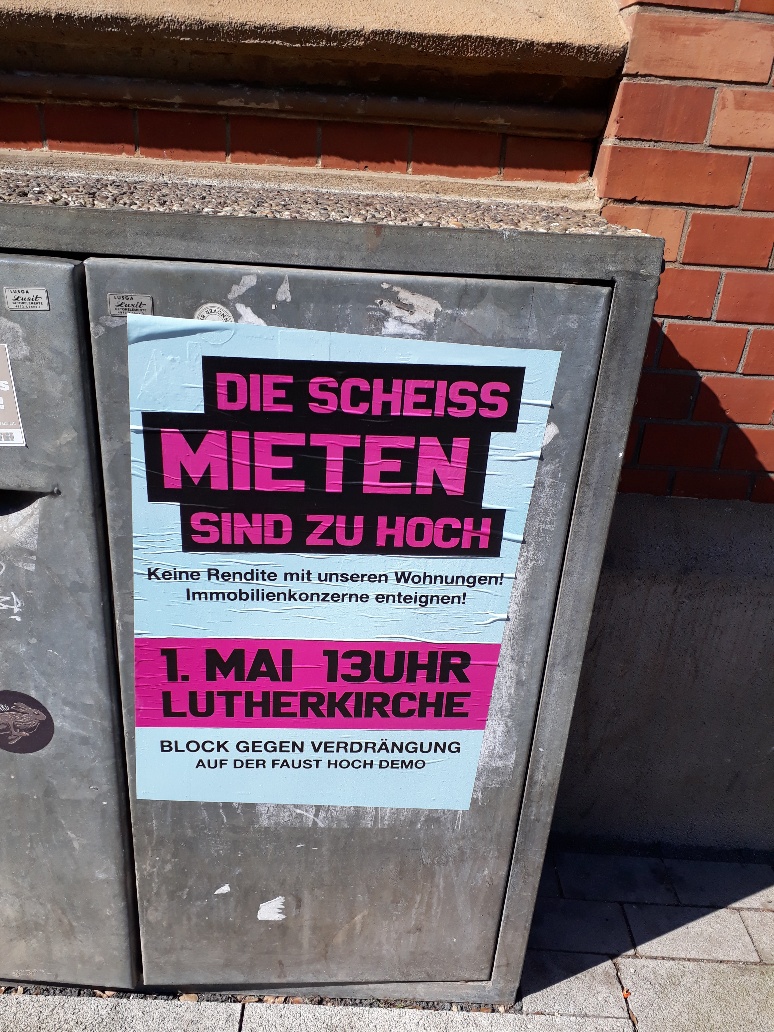 1. Mai, Faust hoch Demo, Block gegen Verdrängung. Wer sich ein bisschen in subkultureller Semantik auskennt, weiß, dass es bei der hier angekündigten Veranstaltung eher vermummt und rustikal zugeht. Nachdem ich den letzten 1. Mai in Hannover als so deprimierenden Tiefpunkt der jahrelangen negativen Entwicklung der 1. Mai Veranstaltungen erlebt habe, dass ich mir vornahm, den diesjährigen lieber in Berlin zu feiern, besteht also Hoffnung, dass sich was verändert. Die Mietensituation spitzt sich so dramatisch zu, dass sie sich als Kulminations- und Schnittpunkt diverser politischer Strömungen zu entwickeln scheint, radikale linke Formen des Protestes inclusive. Und das ist dringend nötig, denn bisher ist die wachsende Spaltung zwischen Arm und Reich nur trübbraunes Wasser auf die erbärmlichen Mühlen rechter Rattenfänger.