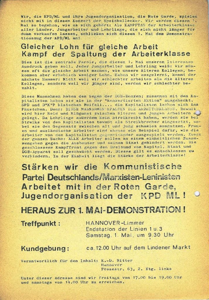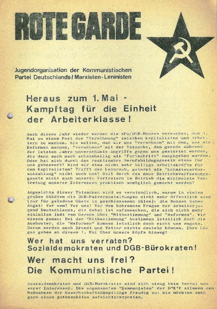 Auf die KPD-ML stieß ich, als ich recherchierte, wie viele 1. Mai Demos es denn heuer in Berlin gibt. Es sind mehr als 20. Das übertrifft meine Erwartungen bei weitem und ich bräuchte einen Hubschrauber, um alle auch nur einmal anzugucken.