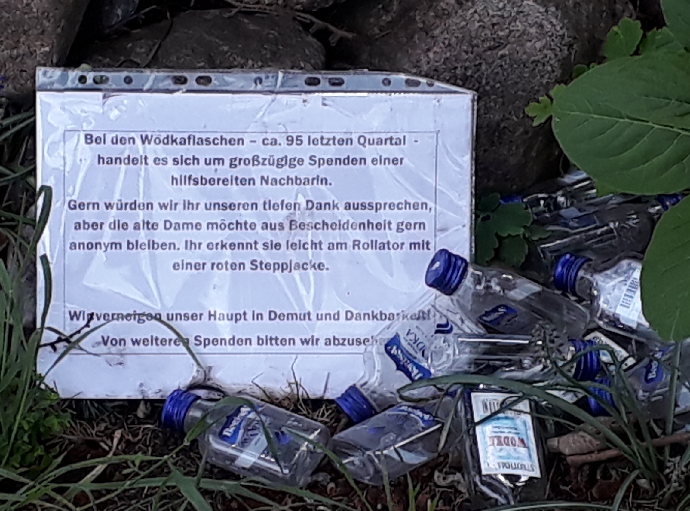 Fundsachen, die Freude machen. Gibt es beim Führen eines Rollators eigentlich eine Promille Grenze und was trinkt die gute Frau sonst noch am Tag? Mich hat nicht nur die Fundsache als solche gefreut, sondern auch die Tatsache, dass endlich mal jemand so im öffentlichen Raum reagiert, wie ich es auch tun würde. Gut zu wissen, dass man nicht allein ist.