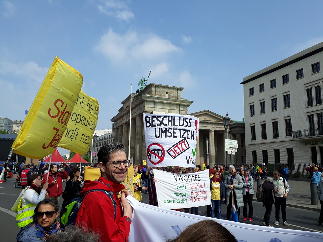 Noch aber sind Demonstrationen wie die hier am 1. Mai am Brandenburger Tor möglich, wo ich mein Lieblings-Allzweck-Transpi entdeckte, bei dem ich vermute, dass es in dieser Form nur in Deutschland möglich ist, wo die Beschlusslage die Mutter aller Dinge ist. Ich werde sowas anfertigen lassen, von Künstlerinnen, und das zukünftig auf jeder Demo einsetzen.Passt immer.