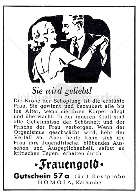 Frauengold wurde später verboten, weil es krebserregend war, hatte aber enormen Erfolg einfach deshalb, weil es hochprozentigen Alkohol enthielt und sich die Mädels damit ordentlich die Kante geben konnten unter medizinischen Vorwänden, was sonst in den reaktionären 50ern für Frauen verpönt war.