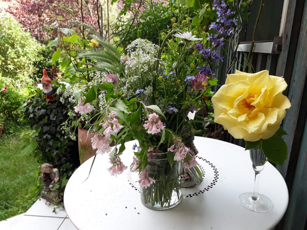 Die natürliche Schönheit eines Feldblumenstraußes und die klassische Eleganz einer David-Austin-Edelrose gehen hier eine zauberhafte Symbiose ein und spenden ästhetischen Trost in politisch düsteren Zeiten. Ästhetik ist eine sublime Form von Sinnlichkeit und die hohe Schule der Genussfähigkeit. Schützt aber leider vor Barbarei nicht. Es gibt jede Menge kultivierte Barbaren, was ein weiteres Indiz dafür ist, dass die Kultur ein ganz zweischneidiges Ding ist, wohingegen die Zivilisation ein unter allen Umständen hochzuhaltendes Wesen ist. Ein Wesen, das kultivierten Barbaren, wie eben Nazis, vollkommen abgeht.