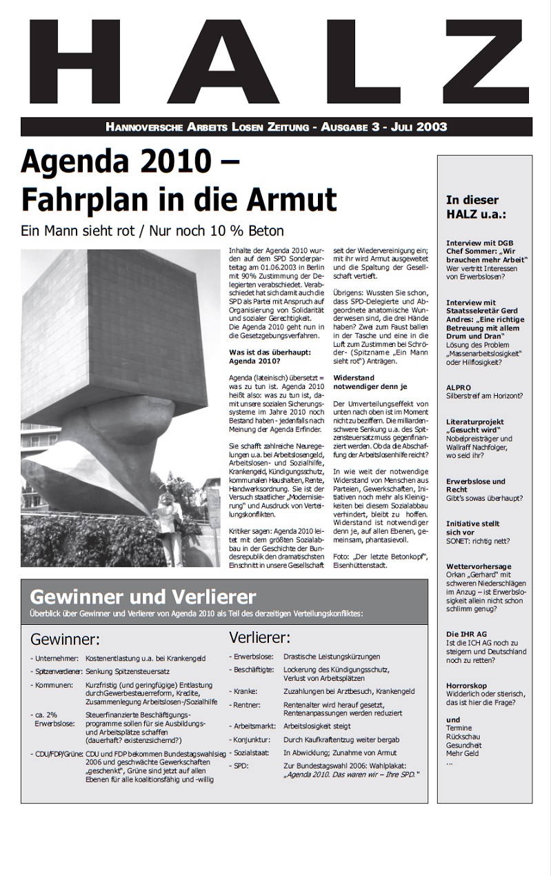 HALZ Nr. 3, 2003, zur Agenda 2010. Mit meinen Prognosen lag ich nicht schlecht, u. a. was die SPD als Verliererin der von ihr losgetretenen Agenda 2010 anging. Dass die Grünen Opportunistinnen reinsten Wasser sind und jede Schweinerei mitmachen, war mir nicht erst 2003 klar. Das wusste ich im Moment ihrer Gründung.