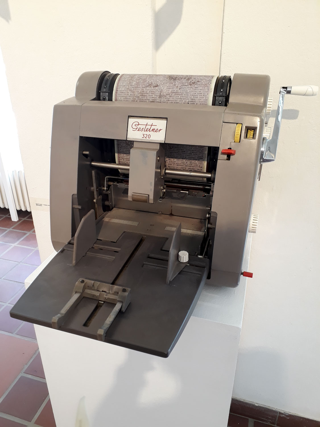 Matrizendrucker Gestetner 320, gesehen in der Ausstellung „DRUCK DRUCK DRUCK“ in der Galerie Körnerpark in Neukölln. Noch bis in die ersten Semester meines Studiums war die Erstellung von Kopien mittels eines Matrizendruckers ein gängiges Verfahren. Von einer Druckvorlage, der Matrize, konnten bis zu 100 Kopien hergestellt werden. Dazu musste die Vorlage über eine Walze genudelt werden, die den Druck produzierte. Typisch war der Spiritusgeruch bei dem Verfahren, weil das zu bedruckende Papier im Druckvorgang mit Alkohol befeuchtet wurde. Dieses Verfahren war also im Gegensatz zu dem nachfolgenden und heute üblichen Kopiervorgang ein sinnlicher Akt, der Körpereinsatz bedurfte und mit intensiven Gerüchen verbunden war, so wie mit typischen mechanischen Geräuschen