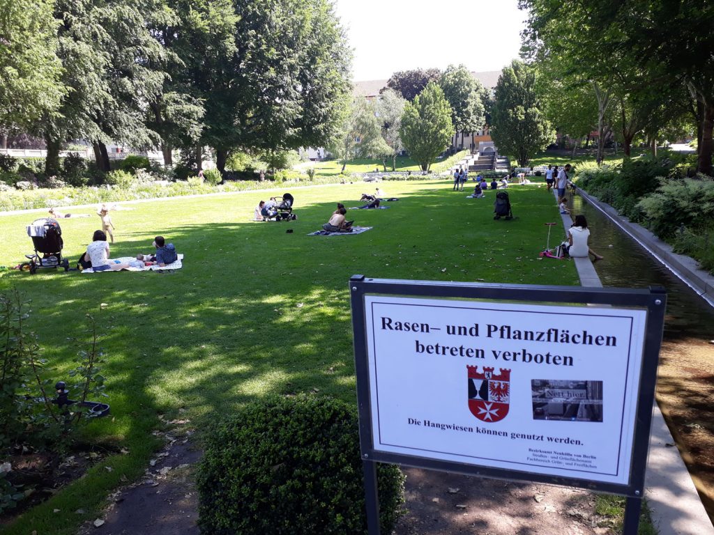 Mein Lieblingspark in Berlin: Körnerpark, Neukölln. Ein kleiner Park aus dem vorigen Jahrhundert, der fast ausschließlich von Anwohnerinnen genutzt wird. Mit einer Orangerie inclusive kleiner Galerie und Restauration, ein paradiesischer Ort für Flaneure. Beim Anblick dieser undisziplinierten Horden, alles Familien mit Brut, quollen allerdings finstere Gedanken in mir hoch. Ich hätte gerne ein Megafon dabei gehabt und würde laut gebrüllt haben: „Habt Ihr alle Scheiße auf den Augen? Hier steht groß und deutlich „Rasen betreten verboten“!“ Ich hätte so lange gebrüllt, bis dieses Pack sich vom Rasen getrollt hätte.
