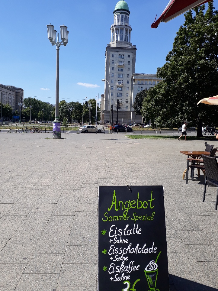 Turm am Frankfurter Tor, Berlin, mit Laternenpfahl und Werbeschild „Eislatte“.