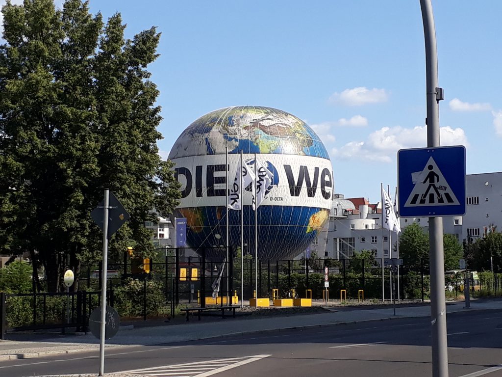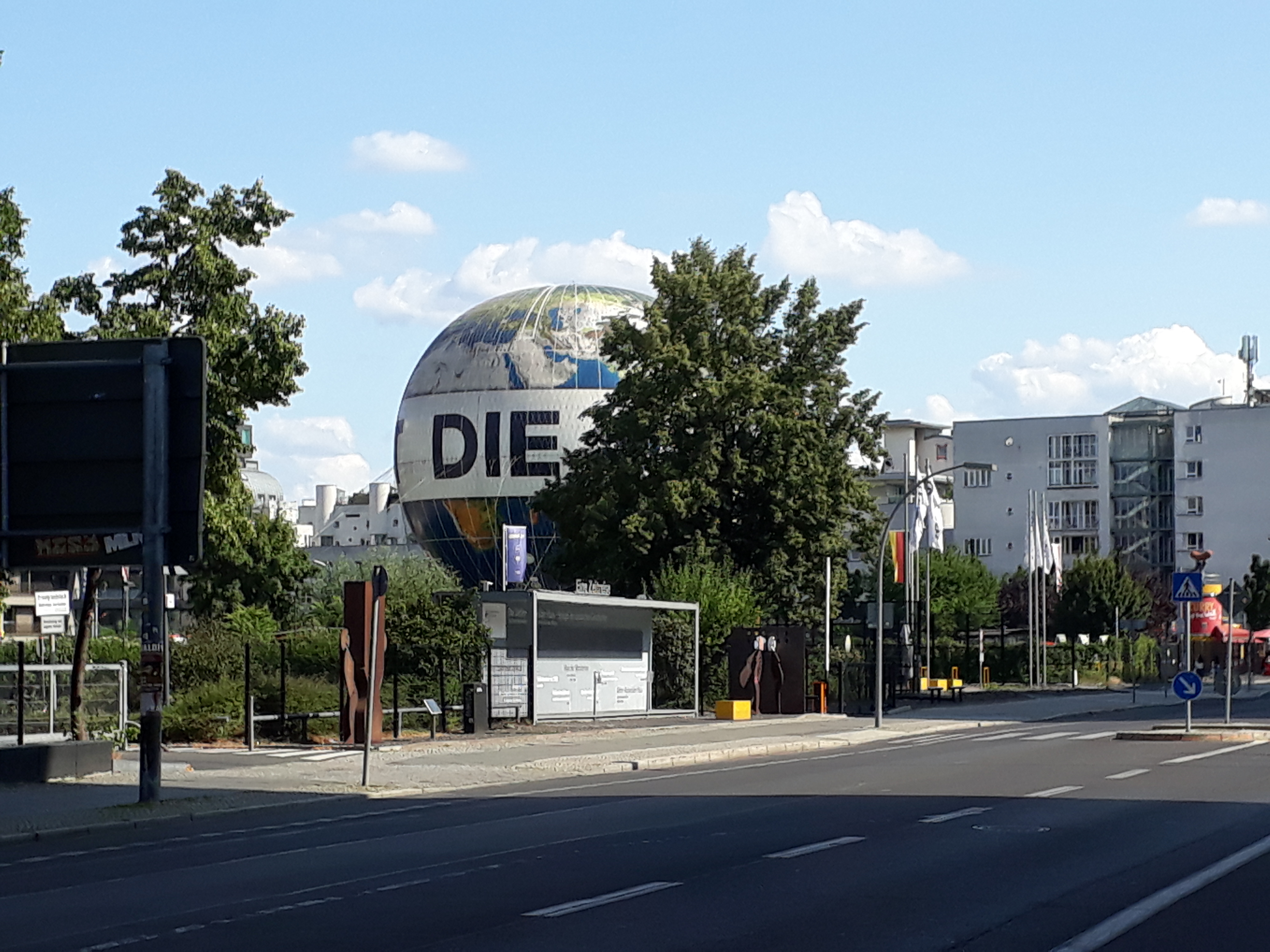 Die! Berlin, Nähe Checkpoint Charlie. Potzdonner, dachte ich im Vorbeiradeln, ein fulminanter, kreativer Weckruf zum Zustand der Welt. Stirb, Globus! Ein Menetekel, die Zeichen aber nicht an der Wand, wie im famosen Heine-Gedicht von König Belsazar, sondern im Wind, den schwankenden Zustand von Mutter Erde im Werk aufnehmend. Großartig, welch Künstlerin steckt dahinter? Frug ich mich, trat in die Eisen und eruierte. Aber ach!