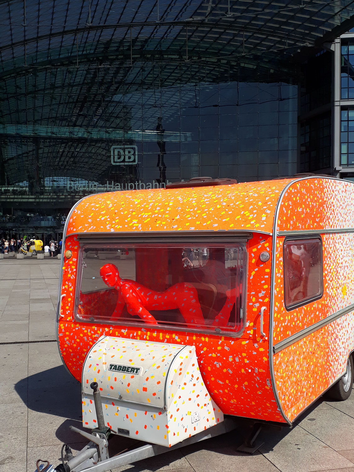 Installation vor dem Berliner Hauptbahnhof. Die kleinen Aufkleber überall sind Preisschilder. Es geht um die Situation von Sexarbeiter*innen, oft mit migrantischem Hintergrund, oft unter lebensgefährlichen Bedingungen, weil „Lovemobils“ (Love?) z. B. an einsamen Plätzen stehen, was Raub, Vergewaltigung und Mord begünstigt.