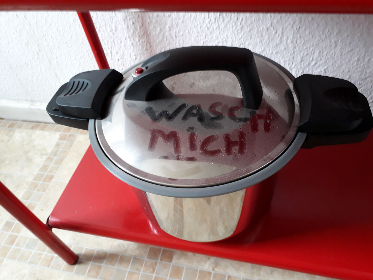 Mein Rat in Sachen Kommunikation, Konfliktlösung und Kreativität ist, Botschaften wie die Obige nicht an die interne WG-Pinnwand zu schreiben, in der Art: „Hier könnte mal wieder jemand in Sachen Hygiene aktiv werden. Ich hab’s die letzten 6 Monate gemacht!!“. Das sieht nach Korinthenkacker und Kleingeist aus und damit ist man sofort in der Defensive. Ritzt man es – siehe oben – in den Staub von Äonen, mit einem Smiley und dem metaironischen „Wasch mich!“, verrät das: Hier waltet ein souveräner Geist, der mit einem Friedensstiftenden Augenzwinkern unangreifbar über allen Wassern schwebt. Und wenn der Topf 4 Jahre später noch so aussieht, dann kann man immer noch die Hasskappe aufsetzen. Und später Außenminister werden.