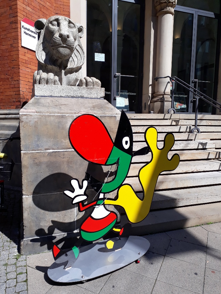 Das ist nicht das Logo zu einer Kampagne für mehr Inklusion, barrierefreies Bauen und Toleranz gegenüber Menschen mit multiplen Behinderungen, sondern das Logo namens Twipsy der EXPO 2000 in Hannover. Gesehen vor der Ausstellung im hannöverschen Kunstverein zur EXPO. Anders als in Lissabon, wo es ein grandioses Gelände von der dortigen EXPO 1998 gibt, hat die EXPO hier keine nachhaltigen Spuren hinterlassen, außer einem neuen Stadtteil und einem gut ausgebauten ÖPNV System. Immerhin. Weder hat die Armut durch die EXPO zugenommen, noch ist der Wohnraum knapp geworden, noch ist der Mensch in einer völlig neuen Qualität den Interessen des Kapitals unterworfen worden. Das ist alles geschehen, allerdings hat die EXPO dazu ungefähr so viel zu beigetragen wie das Oktoberfest in München. Es war eine einzige große Party, die nicht einmal besonders gut besucht war. Ich bin, was die EXPO angeht, komplett vom Saulus zum Paulus geworden. Vorher war ich strikt dagegen, mit jenem klassischen Reflex vieler Altlinker bei jeder Großveranstaltung (Olympia! Komischerweise Fußball nicht) nach Art des Hauses Marx: Whatever it is, I am against it. Da ich damals bei einem EXPO Projekt arbeitete, musste ich zwangsweise auf dem Gelände abhängen. Und ward fortan bekehrt. Das Einzige, was ich bereue, ist, dass ich nicht jeden Tag auf dem Gelände war. Eine EXPO, bei der sich so friedfertig Menschen aus aller Welt zu einer Dauerparty treffen unter einmaligen äußeren Bedingungen jenseits allen Alltags, werde ich vermutlich in Hannover nicht mehr erleben.