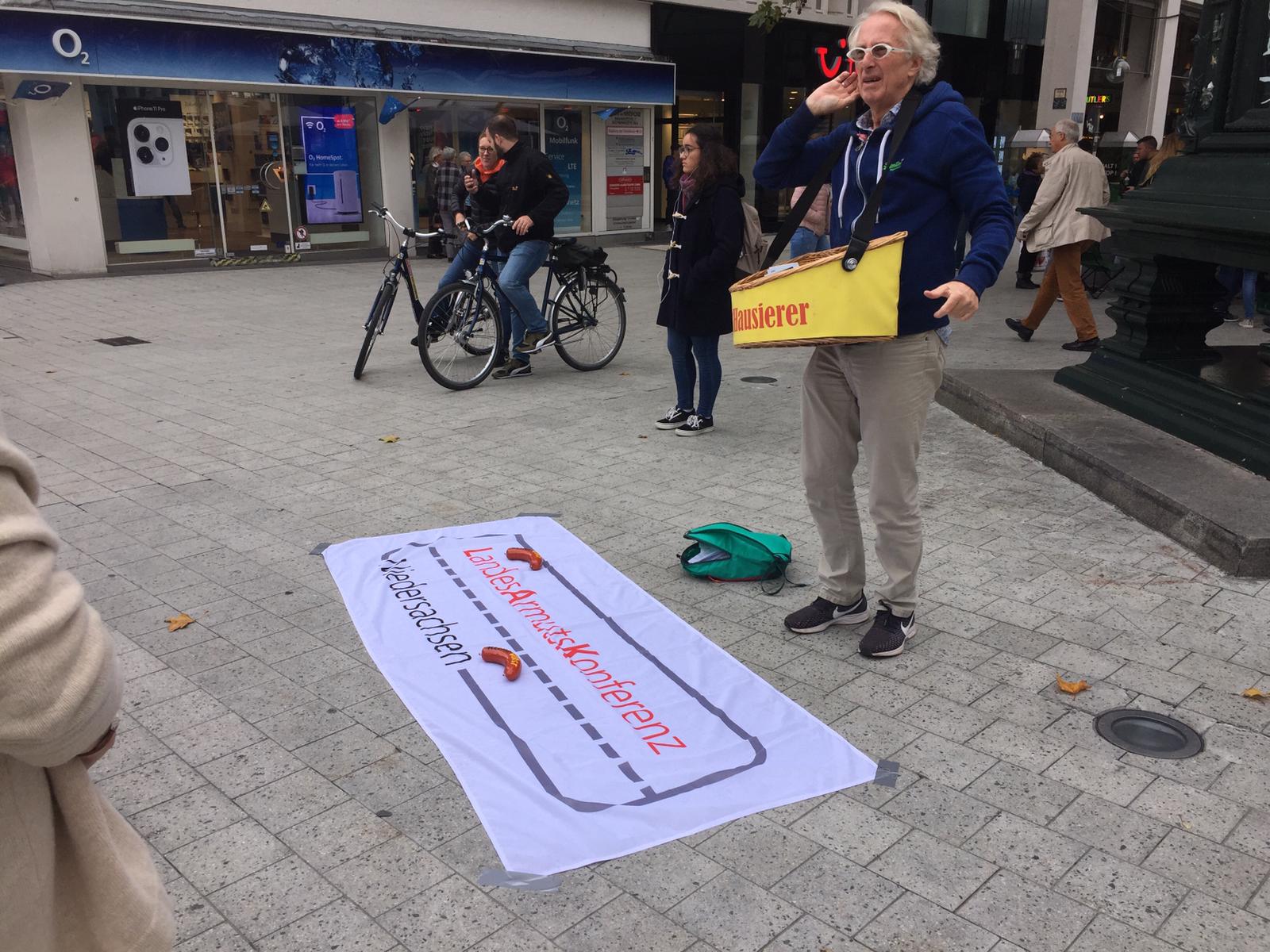 Die Strasse ist brutal. Bei Aktionen, Performance, Theater auf der Strasse kriegt man all seine Schwächen sofort , direkt und brutal gespiegelt. Kein Höflichkeitsbonus eines Publikums auf bequemen Stühlen, die „idealen“ Bedingungen stellen Wind und Wetter zur Verfügung und kein Ton Techniker. Positiv: man braucht nie zu proben. Es kommt niemals so wie man denkt. Zusätzlicher Stress: wenn man auf die Präsenz von Medien hofft, weil die Show Teil der eigenen Öffentlichkeitsarbeit ist. Schön, wenn Publikum kommt, mitmacht und diskutiert. Scheisse, wenn man schwerhörig wird. Das Bild, bei der Aktion „Klima-Wurst“ zum Weltarmutstag 17.10.2019, sagt mehr als 3 Hörtests.