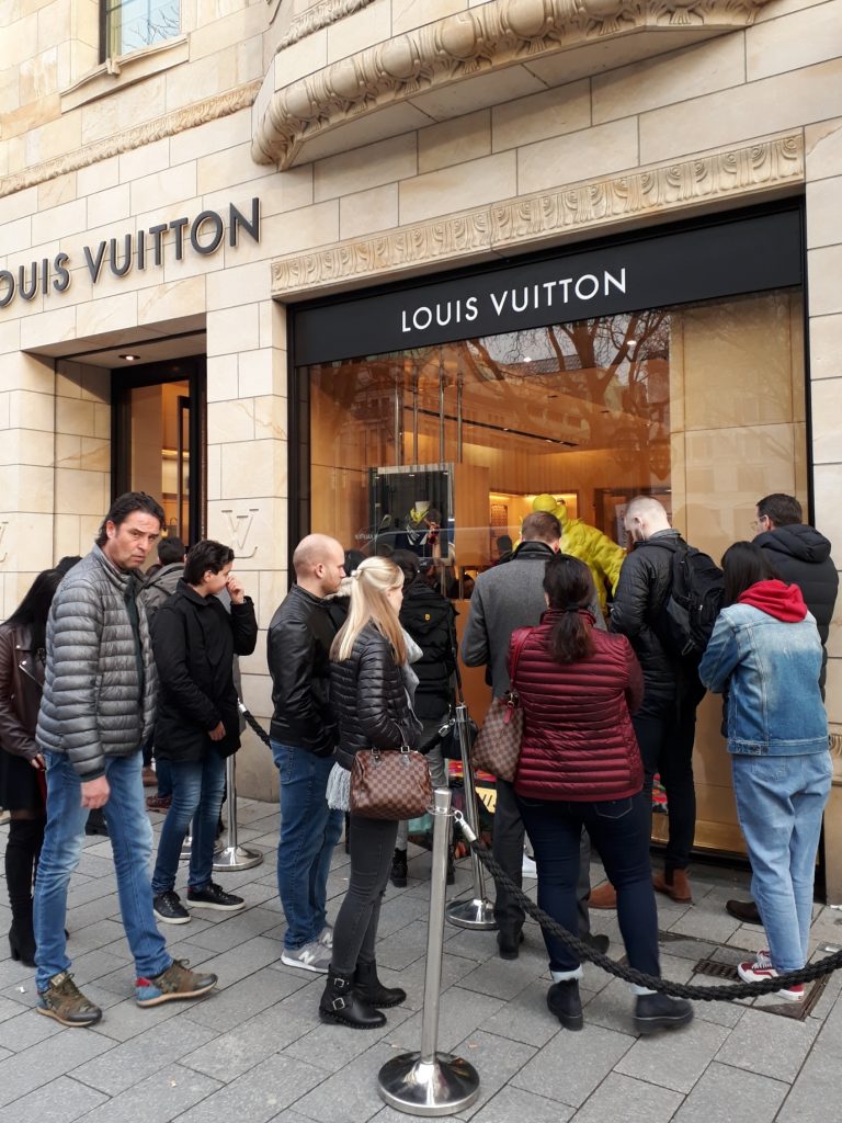 Der Besitzer Bernard Arnault ist mit einem Vermögen von fast 80 Mrd. Euro der viertreichste Mensch der Welt, er besitzt also so viel wie 80.000 popelige Einzelmillionäre zusammen und fast dreimal soviel Taler wie der gesamte Jahres-Haushalt des Landes Niedersachsen. Falls es tatsächlich Leserinnen dieses Blogs gibt, die Louis Vuitton nicht kennen: die leimen so Taschen zusammen, die aussehen wie meine Omma aussen Eichsfeld ihre, wenn wir int Dörpe zum Einkaufen gingen, wo die Kartoffeln reinkamen, nur dass die von Louis Vuitton 2.000 Ocken kosten. Deshalb, und Sie mögen mir den Snobismus verzeihen, sehen die Leute, die sich vor solchen Läden drängeln, zumeist voll Scheiße aus, über ihnen schwebt eine Proll-Aura, die den Mann von Welt und Dandy einen Riesenbogen um solche Stätten machen lässt. Überflüssig zu erwähnen, dass die ganze Kö runter aufgereiht wie an einer Perlenschnur Bettler vor den Läden hocken.