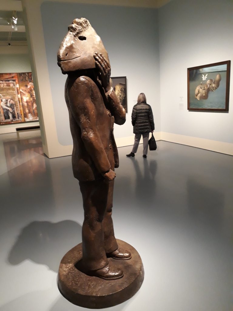 Sonst gab mir die Ausstellung wenig, nach wie vor am meisten beeindrucken mich die Meister der alten Leipziger Schule wie Tübke, Mattheuer (siehe Bild) oder Heise, die eben auch wegen ihrer ästhetischen Qualität die bekanntesten Pinselquäler von drüben waren. Aus dem Osten also nix neues, für mich. Unangenehm fand ich nur die dauernde Rempelei auf den Hinweisen zu den Bildern gegen eher systemimmanente sogenannte „Staatskünstler“ ( „ … lieber vom Leben gezeichnet als von Sitte gemalt..“) und das Hineininterpretieren von systemkritischen, dissidenten Symbolen und Aussagen in jedes zweite Bild, egal ob es passte. Ja, nee, schon ok, wenn ich vom Amt komme, bin ich immer schlauer. Oder wie es der Alkmeister im Faust so treffend formuliert: