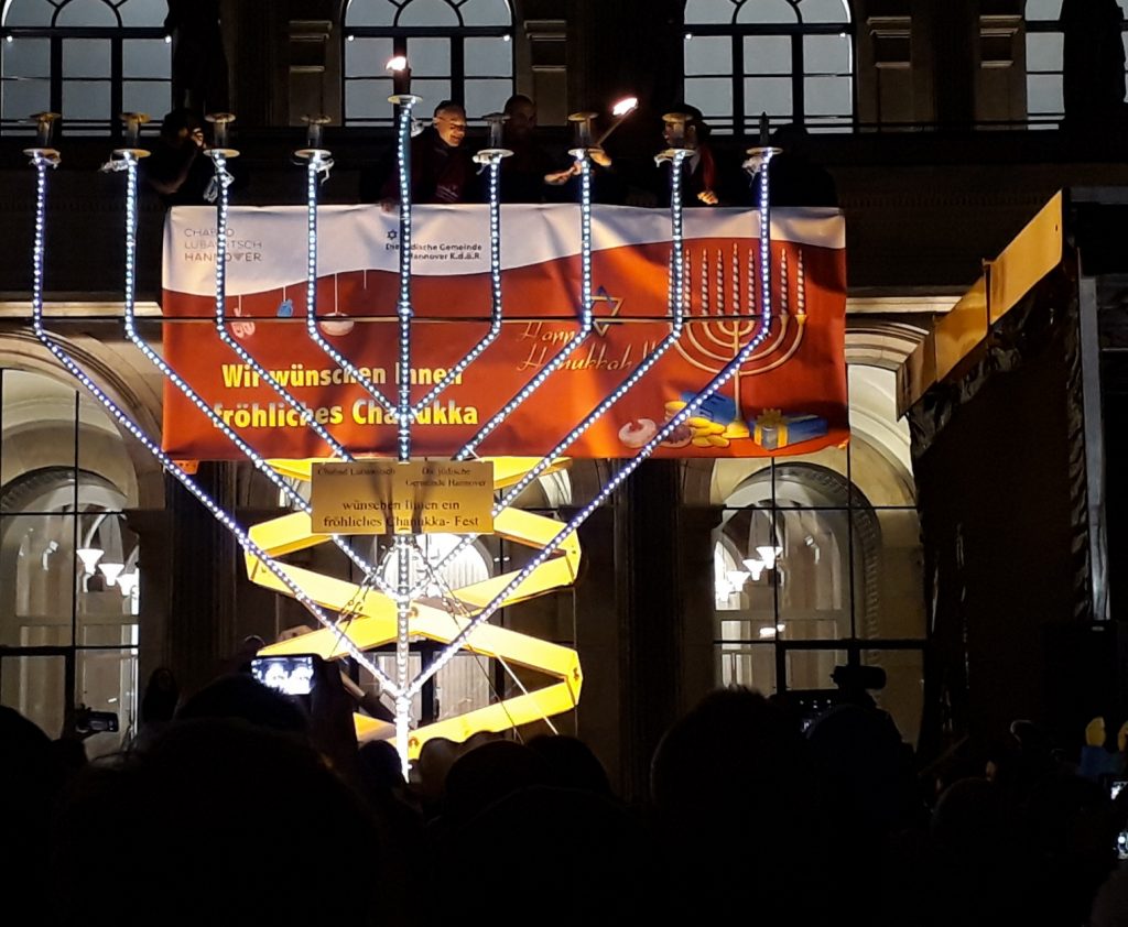 Chanukka-Feier, Hannover Opernplatz, 22.12.2019. Mit dem Lichterfest Chanukka feiern die Juden ihren Widerstand gegen die hellenistische Besetzung vor über 2000 Jahren und die Bewahrung ihrer Religion. Ein Symbol ist das Anzünden der ersten von 8 Kerzen. Das wurde auf dem Opernplatz in einer öffentlichen Feier zelebriert, mit der auch ein Zeichen gegen den wachsenden Antisemitismus gesetzt werden sollte. Immerhin knapp 1.000 Menschen waren da. Ich war matt und platt und musste mich von meiner Liegestatt hochwinden. Wäre ich gläubig, hätte ich mich an den HERRN gewandt. Ich bin mir sicher, dass das ein älteres, bärtiges, männliches, weißes Wesen wäre, gäbe es so etwas in der Art. Eine jüngere, schwarze Frau als Göttin würde schwerlich soviel Schwachsinn auf der Welt zulassen.
