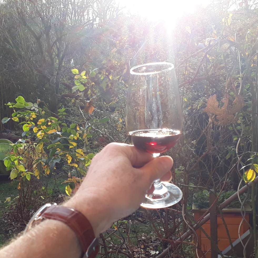 Funkelnde, rubinrote Reflexe in der tieffliegenden Mittagssonne. Eine konzentrierte Aromenfülle von üppiger Süße. Aber jeder nur einen winzigen Schlock. Genuss halt, Schule der Sinne und ästhetische Bildung. Nix zum Saufen.