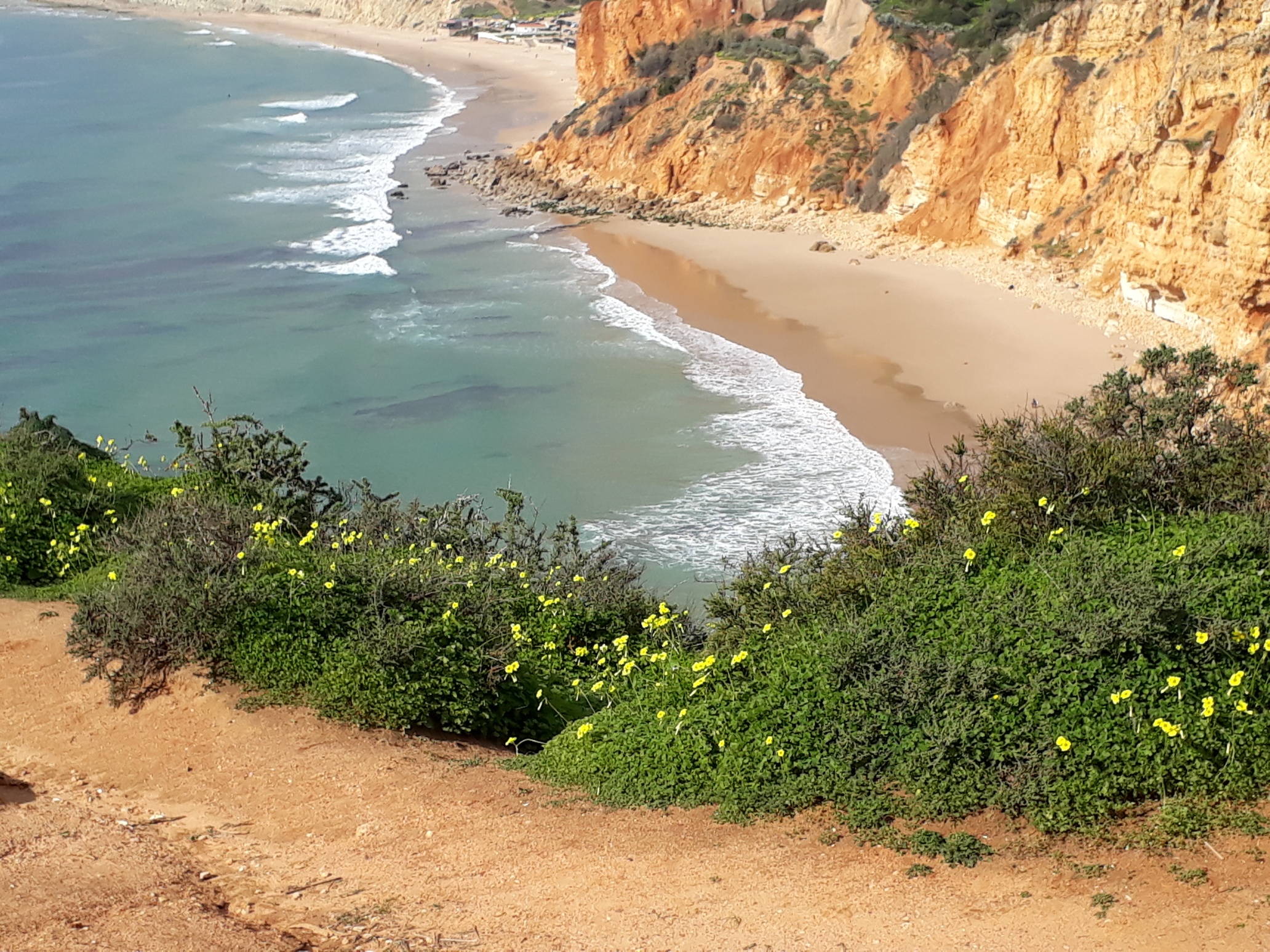 Felsküste Algarve, mit Grünzeug, im Jänner. Ein überaus entspannender, die Seele streichelnder Anblick, Bronchien befreiende Seeluft, Stille, Menschenleere. Sieht man von einem jungen Pärchen ab, das direkt auf der Felskante stehend ein Selfie macht. Früher hätte ich diese Minderintelligenzler noch gemaßregelt, heute sage ich mir: Lass segeln, besser, soviel Blödheit vermehrt sich erst gar nicht.