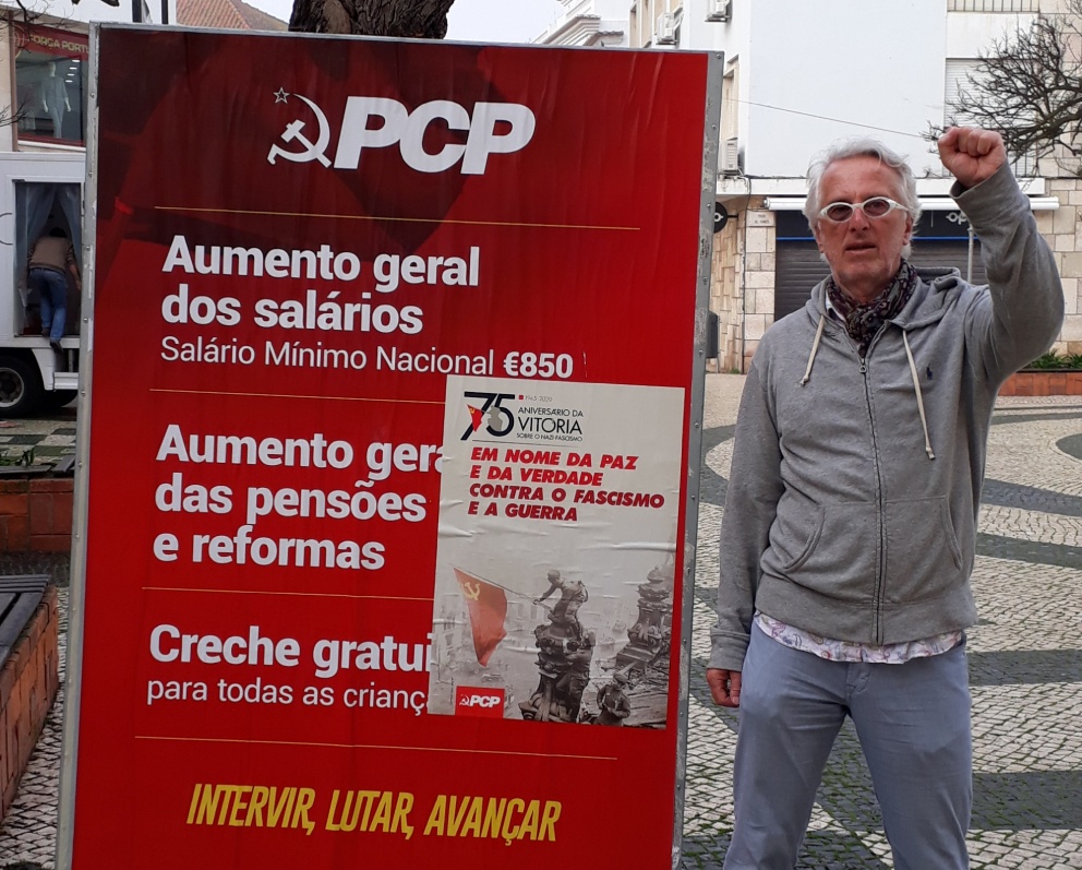 Später den Salonbolschewistischen Klassenkampfposeur gegeben, vor Plakat der kommunistischen Partei Portugals, die immerhin noch im Parlament vertreten ist. Die Forderung auf dem Plakat nach einer Erhöhung des Mindestlohns auf 850 Euro ist angesichts der Preisniveaus in Portugal, das nicht sehr weit von unserem ist, ebenso einleuchtend wie utopisch. Real beträgt er zurzeit 600 Euro, im Hotelgewerbe an der Algarve werden ca. 700 Euro Durchschnittslohn gezahlt.
