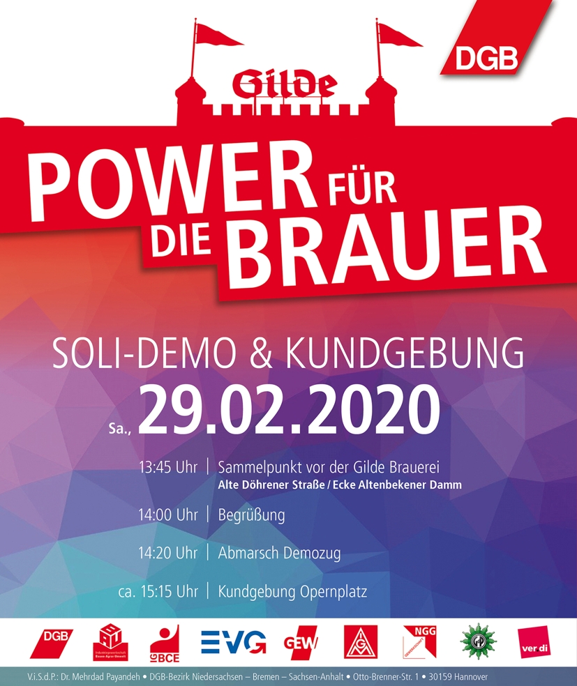 Streik der Gilde-Brauer, Soli-Demo am 29.02.2020. Eigentlich ein kleiner, regionaler Streik von einer Handvoll Beschäftigten, der aber mit erbitterter Härte geführt wird und weit über die Brauerei hinaus Bedeutung hat. Wenn die Beschäftigten den verlieren, hat das Signalwirkung. Es geht darum, ob die Arbeitgeber Erfolg haben mit Tarifflucht, Lohndrückerei und Spaltung von Belegschaften. Wenn sie damit an dieser Stelle Erfolg haben, ist das ein Signal an alle Arbeitgeber, im Zweifel auch so zu verfahren, vor allem bei zukünftigen Rezessionen. Corona, ick hör Dir trapsen.