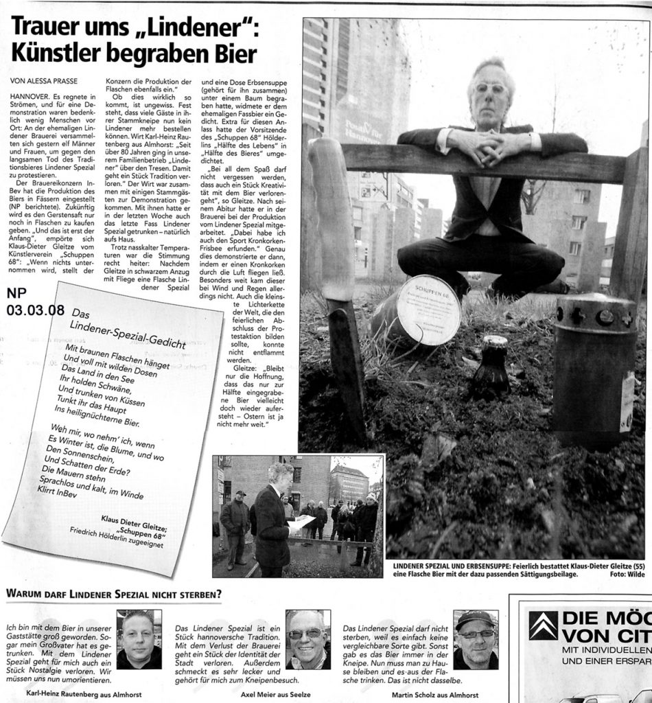 Aktion von 2008 zur Rettung der lokalen Brauerei, bei der ich nach dem Abi ein paar Monate gearbeitet hatte. Die Arbeit war nur im Vollrausch zu ertragen, aber als Flaschenabfüllanlagenbediener war ich ja an der Quelle. Den Artikel habe ich rausgekramt, weil ich zur Zeit mit einer Intervention zum 250. Geburtstag des größten Dichters deutscher Zunge Friedrich Hölderlin beschäftigt bin und nachgesehen habe, was ich selber denn schon mal zum Meister fabrizierte. Wir wollen zu meinen Gunsten annehmen, dass ich die damalige Aktion im Bild oben im Drogenrausch oder Vollsuff geplant habe. Aber meine Hölderlin Nachdichtung des anrührend-grandiosen Poems „Hälfte des Lebens“ in obigem Artikel hat was. Das Original wollen Sie bitte hier nachlesen. Meine Intervention trägt übrigens als Titel den klagenden Ausklang des Gedichtes „Im Winde klirren die Fahnen“. Mehr dazu demnächst. Bleiben Sie drin!