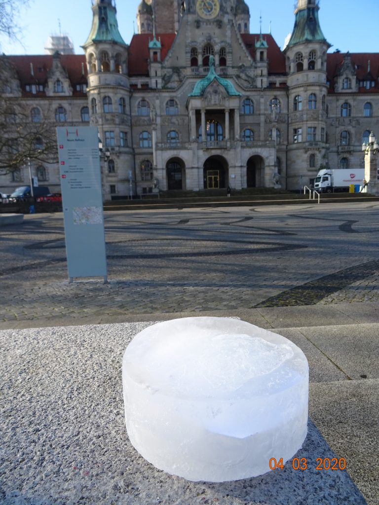 – Eisblöcke mit dem Gedicht im Inneren werden vor öffentlichen Orten wie Rathaus, Krankenhaus, Schule deponiert.