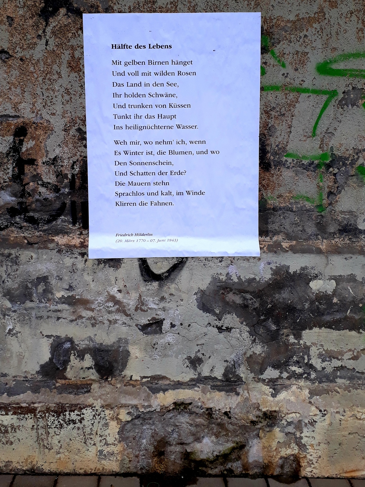 „Friedrich Hölderlins Lyrik ist einzigartig im deutschen Sprachraum: Rauschhaft, hymnisch, empfindsam, voll überwältigender Bilder, mitunter rätselhaft, suchend. Anders als seine Zeitgenossen, der gravitätische Großreime-Macher Johann Wolfgang von Goethe oder der spießige Schlichtvers-Schmieder Friedrich „Fest gemauert in der Erden“ Schiller, fand er zu Lebzeiten nicht die Anerkennung, die er verdient hätte. Verzweifelt an den Umständen und psychisch erkrankt verbrachte er die zweite Hälfte seines Lebens im später nach ihm benannten „Hölderlin-Turm“ in Tübingen unter der Betreuung des Schreinermeister Zimmer.