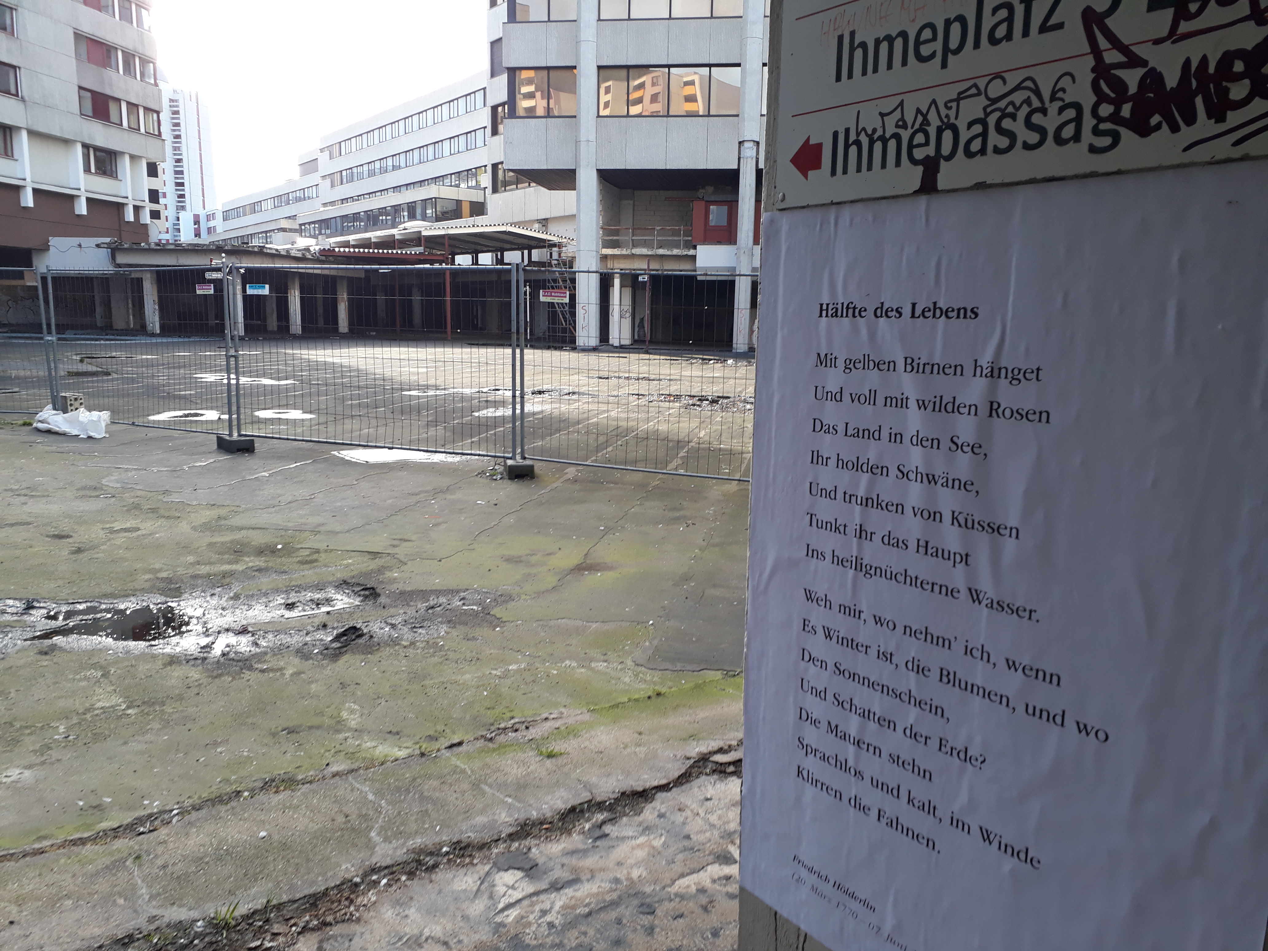– Plakate mit dem Gedicht werden im Stadtgebiet auf Mauern geklebt, die „sprachlos und kalt“ anmuten. (Gestaltung Plakat und Postkarte: design@in-fluenz.de)