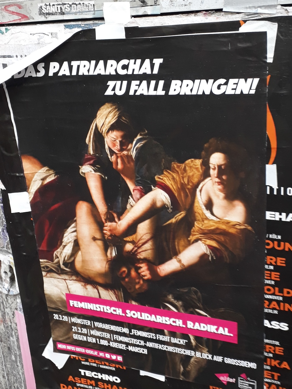 Außerdem wollte ich zu obigem Plakat anmerken: Judith war Kapitalistin, sie beging den Mord mit ihrer Magd, also einer Lohnabhängigen, und sie war radikale Nationalistin, sie stellte das Wohl ihres Volkes mit mörderischer Konsequenz über ihr eigenes Leben. Ich gehe davon aus, Schwestern, dass ihr diese von mir hier skizzierten Nebenwidersprüche, wenn es denn nicht sogar Hauptwidersprüche sind, offen und angstfrei diskutiert habt.