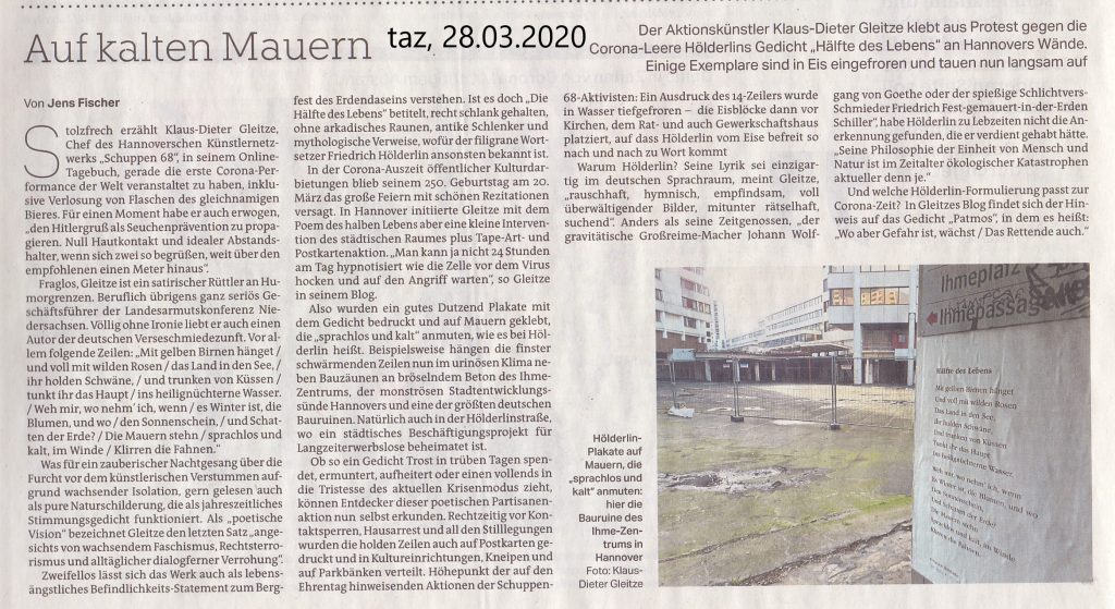 taz Artikel über die März Intervention zum 250. Geburtstag von Hölderlin. Der Artikel hat mir aus zwei Gründen gefallen: 1. Fehlt ihm der hohe Ton, der Hölderlin Artikel sonst mit weihevoller Bildungsbürgerhuberei durchweht und damit hat der Artikel den grundsätzlichen Ansatz meiner Interventionen auch im Duktus getroffen – bei aller Ernsthaftigkeit des Anliegens und aller Autonomie der Kunst sollte in allem ein heiter-leichtes Augenzwinkern wirken, als ob ein Taschentuch im Windhauch unter dem Gelächter der Musen zu Boden schwebt. So ungefähr jedenfalls, ich bin ja kein Hölderlin des Sprachgesangs sondern eher Hufschmid der Satire. 2. Grund: Mir gefällt jeder Artikel über mich. Ein Kulturarbeiter, der behauptet, er sei nicht eitel, lügt oder ist anders begabt (= voll bekloppt) in seiner Selbstwahrnehmung.