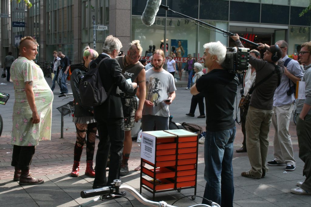 Noch analog – der einzige mobile Witze-Verleih der Welt bei der Arbeit mit Randgruppen und dem NDR-TV, bei der Produktion einer Doku über dieses Start-up. 2009 in der City von Hannover.