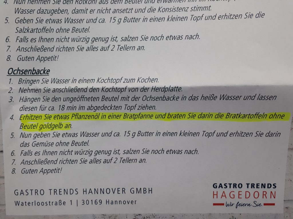 Selbst das Essengehen verlagert sich ins Internet. Unlängst war mir nach deftiger Hausmannskost von meinem dafür zuständigen Restaurant, das krieg ich Zuhause niemals so hin. Zwei, drei Klicks, ein paar Stunden später wurde das Happe angeliefert, im Vakuumbeutel, frisch und lecker. Und hier wenigstens gibt es in der durchaus deprimierenden aber zwangsläufigen Verlagerung der analogen in die digitale Welt eine lustige Geschichte.