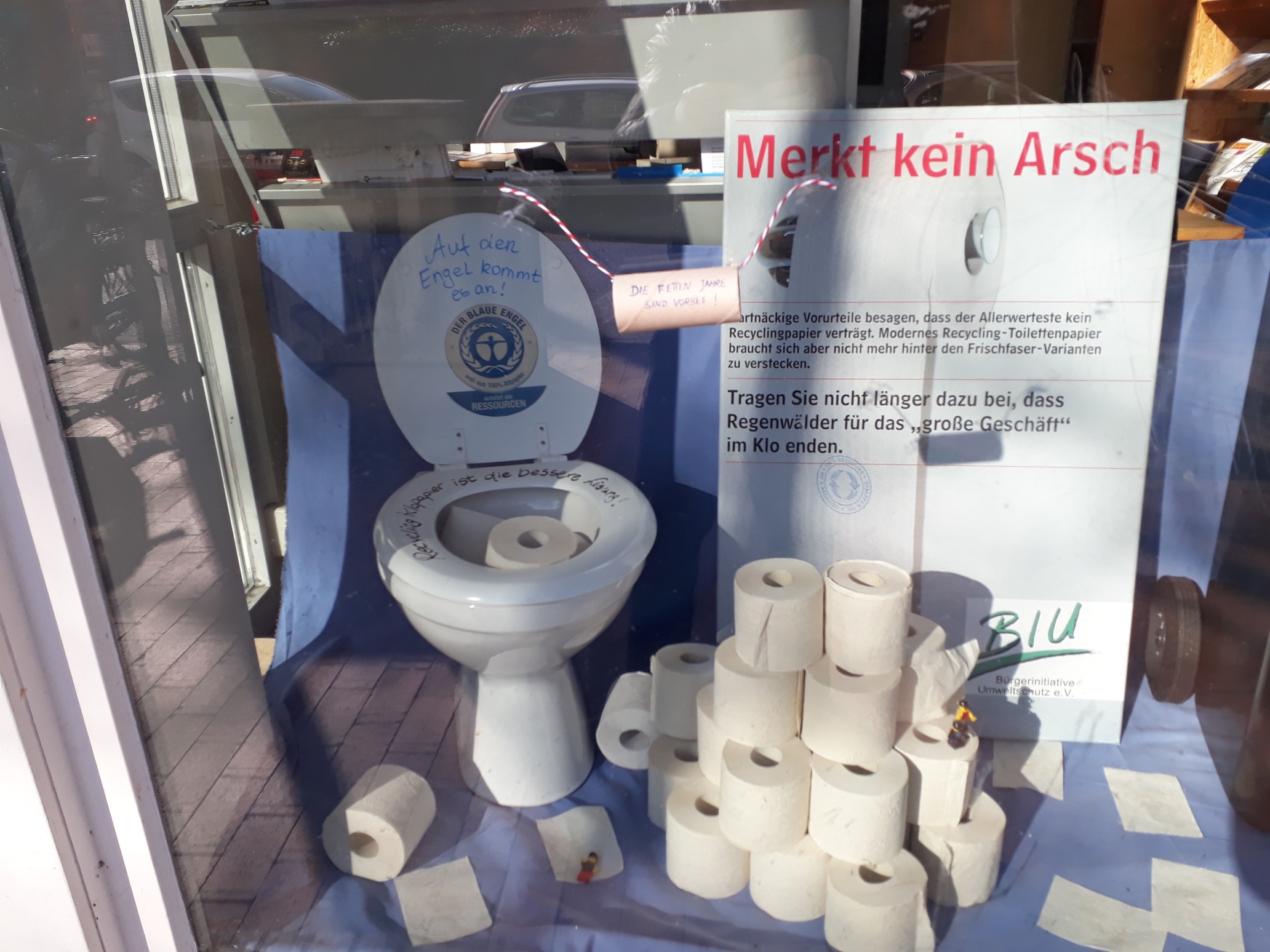Dieser Umweltladen ist bei mir umme Ecke, in einem Viertel, wo Grüne und Linke zusammen die absolute Mehrheit im Bezirksparlament haben und die FDP eine Splitterpartei ist. Jede zweite Einwohnerin ist Sozialarbeiterin oder Lehrerin, der Rest macht irgendwas mit Medien, Kultur oder Arbeitslosigkeit. Da gibt’s haufenweise Umweltläden wie den obigen, Dritte-Welt-Läden oder öffentliche Kuschelstuben. Alle lächeln sich beim Corona-Abstandhalten-Wettbewerb freundlich zu, soweit unter den seuchenartig sich ausbreitenden Masken erkennbar, und eine rosazarte Wolke von kollektiver Zärtlichkeit schwebt über diesem Viertel. Was mir seit Jahren schwer auf den Sack geht in seiner selbstreferentiellen Kiezbesoffenheit, deren Horizont am Ende der nächsten Kneipentheke endet. Deswegen ziehe ich aber noch lange nicht in einen sozialen Brennpunkt.
