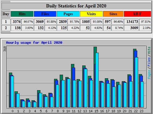 Statistik Blog-Tagesverlauf 01.04.2020. 1005 Visits (=Besucherinnen), die 2839 Pageimpressions (= einzelne Klicks im Besuchsverlauf, z. B. auf ein Bild, oder einen Link) hinterließen. Zwischen 0 und 7 Uhr war Ruhe im Besuchskarton, dann zieht die Kurve an und hat zwei Peaks um 15 Uhr, zum Feierabend hin, und 22 Uhr, zum Bubu hin, noch mal schnell gucken, was der putzige Autor wieder hinterlassen hat.