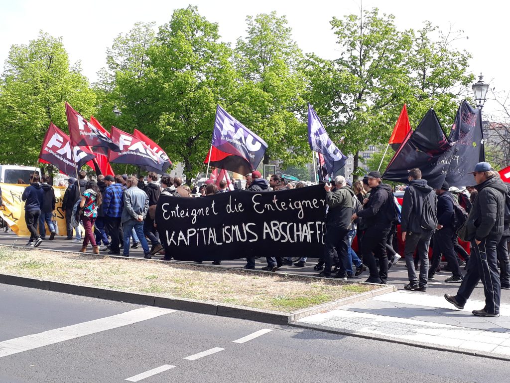 1. Mai Demo 2019, Berlin. Und wer kriegt das ganze enteignete Zeug dann? Das Volk etwa?! Liebe Genoss*innen von der FAU , das würde ich mir beim derzeitigen Zustand des Volkes aber dreimal überlegen. Über den Staat als neuen Eigentümer lass ich gerne mit mir reden, und da sind wir via Staatsbeteiligungen an Konzernen als Folge der Corona-Krise ja auf einem guten Weg. Ich bin mal gespannt, ob die Konzernchefs dann nach TVÖD bezahlt werden.