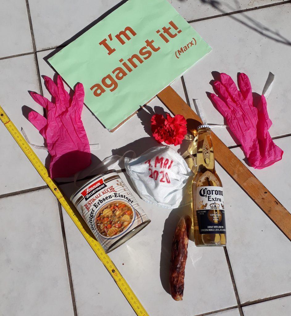 Alle sind aufgerufen, es ähnlich zu machen, also eine 1. Mai-Einpersonen-Demo zu veranstalten, in freier Gestaltung mit passenden Symbolen, Parolen, Outfits. Nach eigener Wahl der Uhrzeit, vom eigenen Wohnort aus, zu den Plätzen, wo die Maikundgebungen ursprünglich stattfinden sollten. Für den Fall, dass es dort zu Begegnungen mit Anderen kommt, gelten natürlich Abstandsregeln und Maskenpflicht. Dadurch wirkt der 1. Mai sowohl auf der Straße, nach außen, als auch bei allen Beteiligten, als Akt politischer Selbstermächtigung und ästhetischer Autonomie.