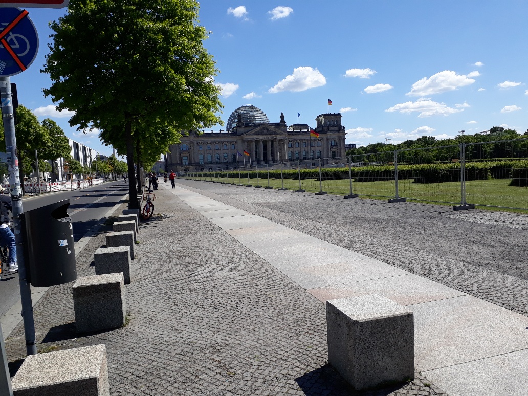 Ein paar Schritte weiter am Reichstag war wieder Atmosphäre pur, ungewöhnliche Ruhe, Menschenleere. An solchen Orten, wo sonst eher Massenaufläufe das Bild prägen, kann man diesen Atmosphärenwandel regelrecht körperlich spüren.