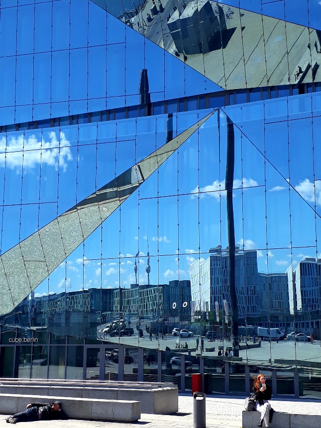 Fassade des Bürogebäudes „cube“ am Berliner Hauptbahnhof. Die Fassade dieses Quadratgebäudes ist gefaltet, im Frank-Gehry-Style. Das ist also nichts grundstürzend Neues, aber durchaus beeindruckend, und ein angemessenes Entrée für eine Metropole, wenn man aus ihrem Bahnhof tritt. Der Berliner Bahnhof ist ein Solitär, selbst wenn man berücksichtigt, dass er gegenüber seinem ursprünglichen Entwurf um die beiden Enden der Gleise gekappt wurde Was für eine architektonische Sauerei das war, sieht man erst richtig in der Draufsicht und für besonders genial halte ich die Idee, das Umfeld des Bahnhofs zusehends mit meist austauschbaren postmodernen Klötzen zuzustellen, auch nicht. Man nimmt dem Gebäude die Wirkung. Dennoch atmen Freunde des Urbanen durchaus erfreut auf, wenn sie diese Kathedrale der Mobilität betreten. Ich war früher öfters auf Bahnhöfen kleineren Zuschnitts unterwegs und die Trostlosigkeit vollkommen verlassener und vernagelter Bruchbuden auf einem Acker, an einem kalten regnerischen Novembertag, in Erledigung irgendwelcher Erwerbsobliegenheiten, haben mich mitunter auf der Rückreise rätseln lassen, wieso ich mich nicht 5 Minuten nach Ankunft in einer naheliegenden Güllegrube ertränkt hatte, so klaftertief depressiv fiel ich regelmäßig angesichts solcher Orte der Einödnis, der Einsamkeit und der Abwesenheit aller Zivilisation. Es muss das Prinzip Hoffnung gewesen sein, was mich aufrecht hielt.
