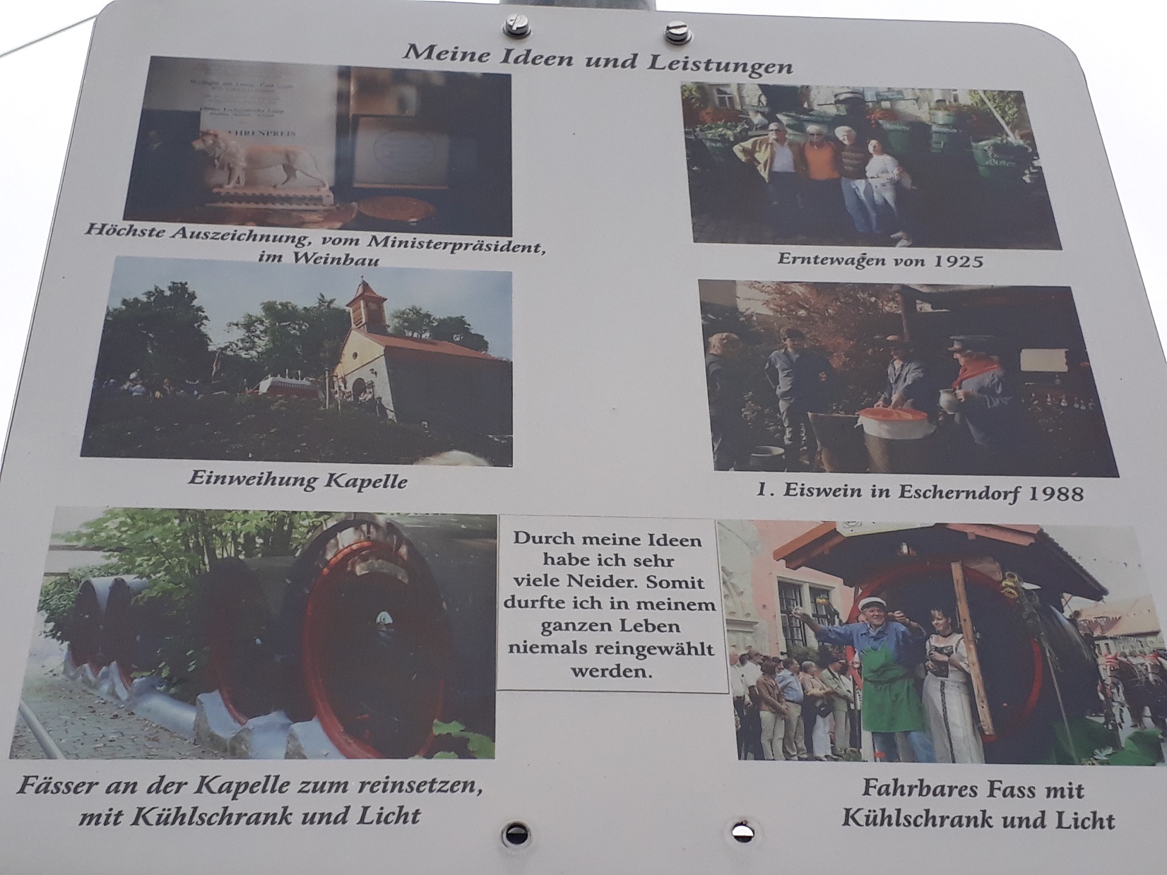 Ausschilderung einer Ersten Lage. Steilhänge bis zu 60 Prozent, kein Wunder, dass ich fit wie ein Turnschuh bin. Und schön, dass da in der Gegend die Lagen oft ausgeschildert sind, so dass man weiß, wenn man sich auf legendärem Terrain (heute sagt der Connaisseur: Terroir) befindet, wie dem Würzburger Stein, dessen Jahrtausendjahrgang 1540 noch im Jahre 1961 trinkbar war.