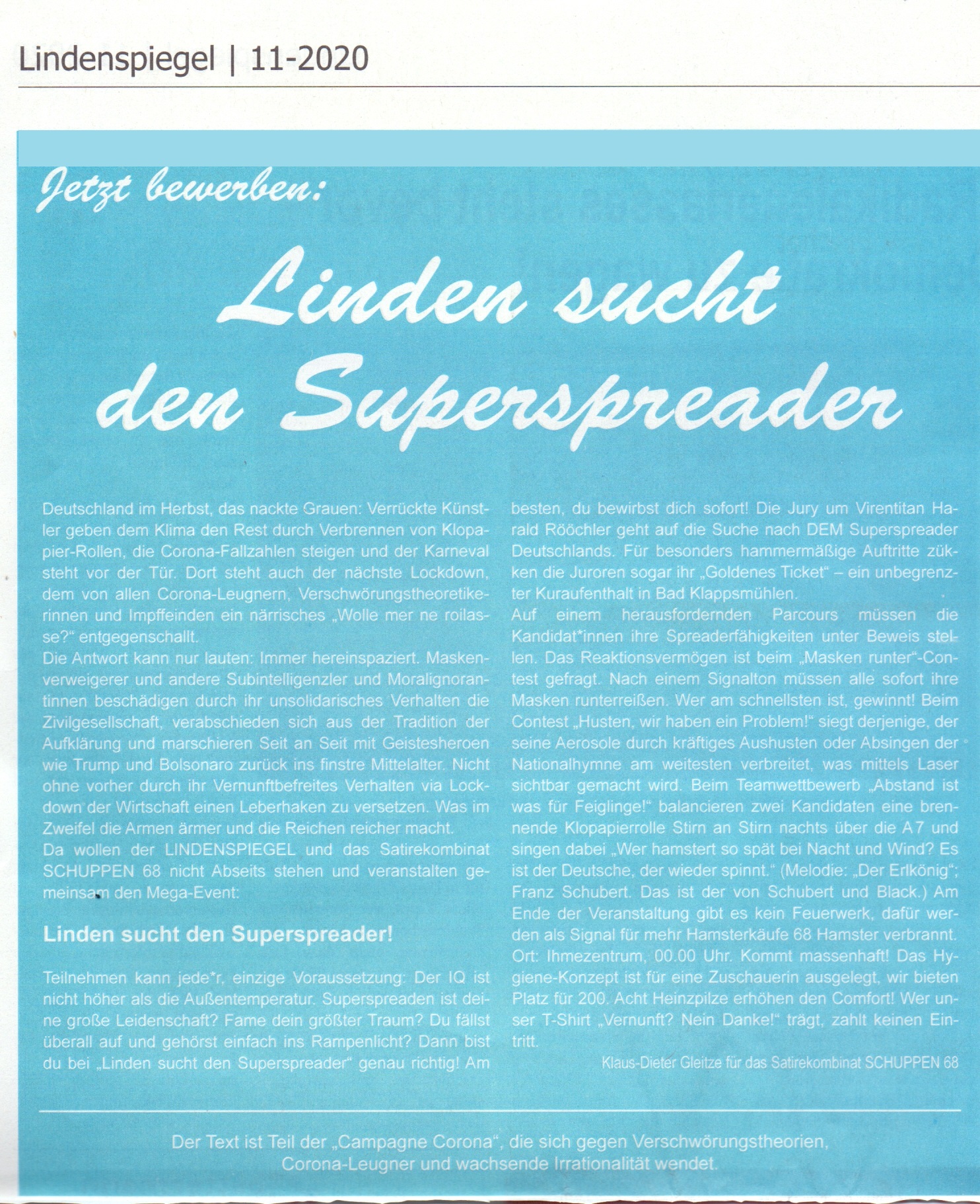 Lindenspiegel 11/20. Mit der machtvollen Waffe der Satire den Feinden der Aufklärung ins Hirn …