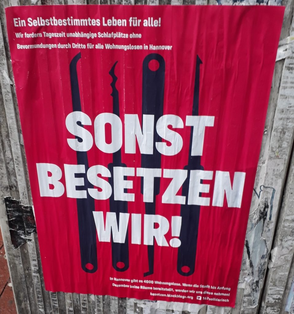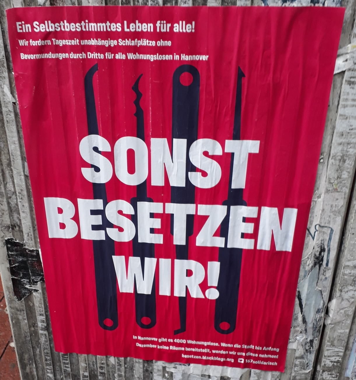 Eins von ca. 3.000 gleichen Plakaten in Hannover. Hintergründe zur Wohnungslosigkeit in Hannover und warum die Initiative jetzt die Werkzeuge zeigt, hier. Das ist auf fast sämtliche Ballungsgebiete zu übertragen.