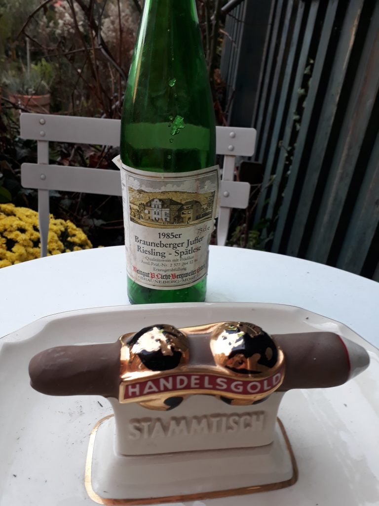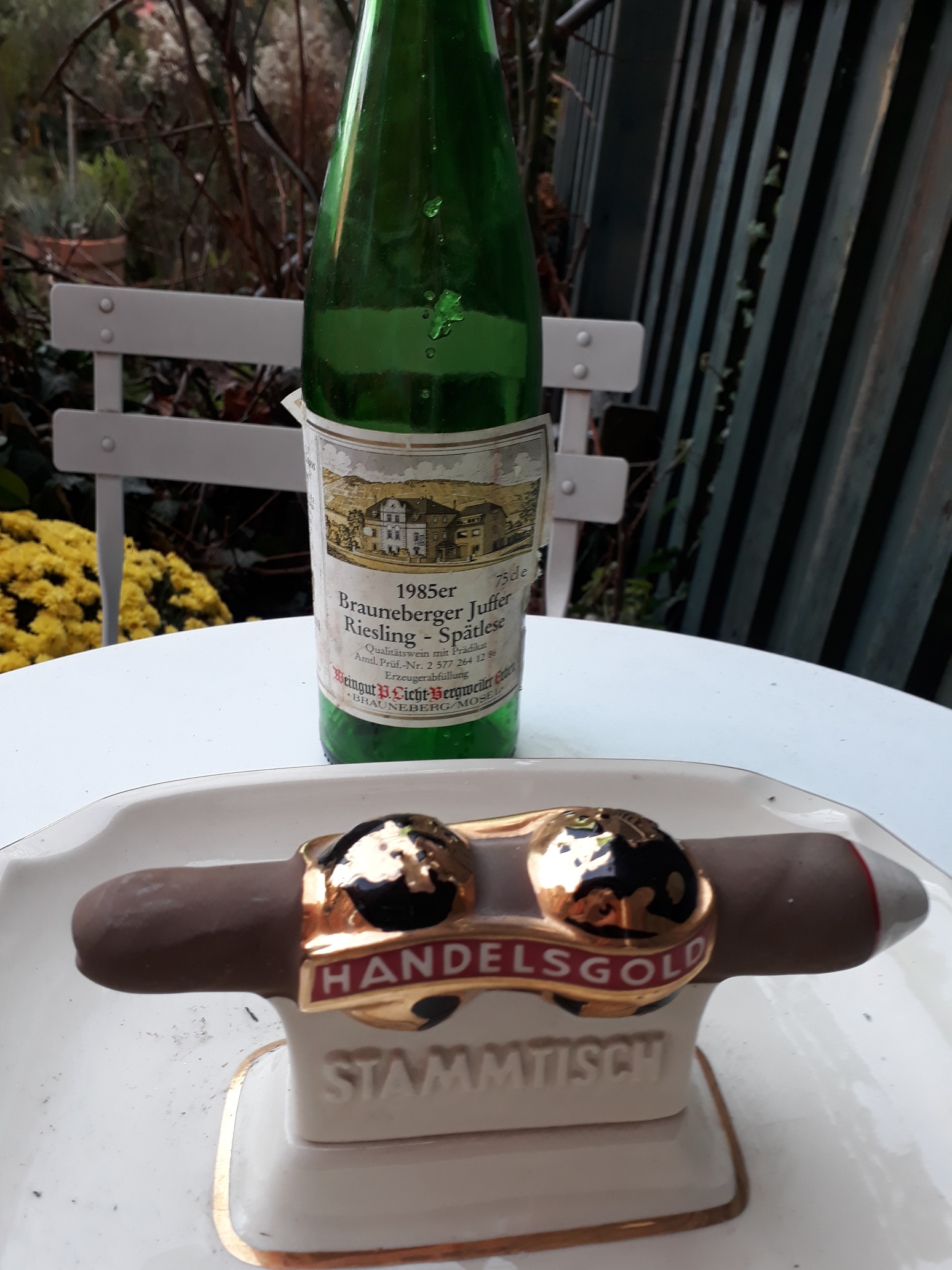 Stammtisch Stillleben mit Brauneberger Juffer, Spätlese 1985. In jenen Zeiten gab es noch flächendeckend Stammtische, die je nach Stand und Einkommen von Bier, Korn und Stuyvesant oder Spätlese und Handelsgold flankiert wurden. Die Nazis der Nation erbrachen ihren geistigen Unrat im Brodem der Kneipen am runden Tisch und den Rest später vor der Tür. Das ganze Setting war ein überaus erfolgreicher nationaler Identitätsstifter und demzufolge kam die Politik auf die famose Idee, den Runden Tisch als Politikinstrument zu initialisieren und die Lufthoheit über die Stammtische erlangen zu wollen, also Nazi-kompatibel zu werden. Was für Folgen das hatte, kann man anhand der Annexion der Ostzone besichtigen, für die der Runde Tisch größere Symbolkraft erlangte als das Brandenburger Tor. Und an der Freiluft-Fortsetzung des Stammtischs, den Verquerdenker-Demos, die im Frisch-Fromm-Fröhlich-Frei-Geist des Turnvater Jahn agieren, der nebenberuflich noch notorischer Antisemit war: Hauptsache an der frischen Luft, in Bewegung und geistigen Unrat absondern. Da wünscht man sich den klassischen Stammtisch zurück, da hatte man das Elend wenigstens nicht direkt vor Augen, und deren Insassen verhielten sich ja extrem lebensverkürzend mit ihrem Alkohol- und Tabak-Abusus, anders als die Frischluft-Nazis. Der Einzige, der auf deren Demos Alkohol verklappt, bin ich mit meinem Flachmann, wenn ich da als Beobachter des Völkischen unterwegs bin.