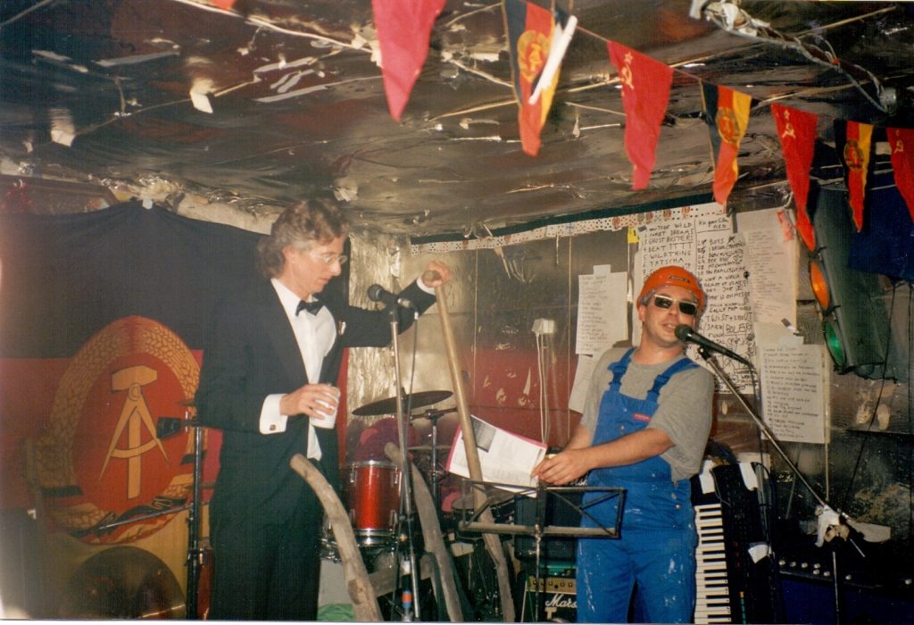 Auftritt des verdienten Künstlerkollektivs SCHUPPEN 68 bei „Silke Arp bricht“, Hannover, 1995, anlässlich des 46. Geburtstages der DDR. Silke Arp machte 1995 das, was heute Avantgarde ist, und war laut Zeit „ … die einzig wirklich großstädtische Lokalität, die es so auch durchaus in Berlin hätte geben können …“. Das Foto zeigt rechts unseren damaligen Hauptdarsteller, den Liebling der Massen Pedder Popstar, bei seiner Performance zur Rede Stalins über die Zwangskollektivierung der Landwirtschaft in der damaligen SU. Das war genauso jenseits allen guten Geschmacks und aller Konventionen wie meine folgende Ode an Erich Mielke in Hexametern, und demzufolge flippte der Ostzonenmob, der sich in den Schuppen (sic!) verlaufen hatte, weil er eine Art rührseliger DDR-Nostalgie a la „Ein Kessel Buntes“ erwartet hatte, völlig aus und wollte uns von der Bühne prügeln.