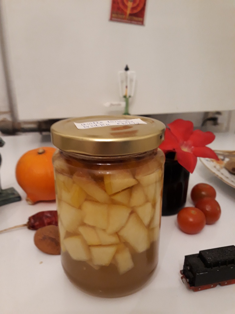 Ereignisreduzierte Tage in Zeiten der Seuche lassen Raum für Experimente und so wandte ich mich dem Quittenbasierten Fruchttopf zu: Quitten mit einem Anteil von 34 Prozent Rohrzucker eine Stunde ziehen lassen, jeweils mit Gin, Wodka und Rum bedecken und mindestens sechs Monate ziehen lassen.