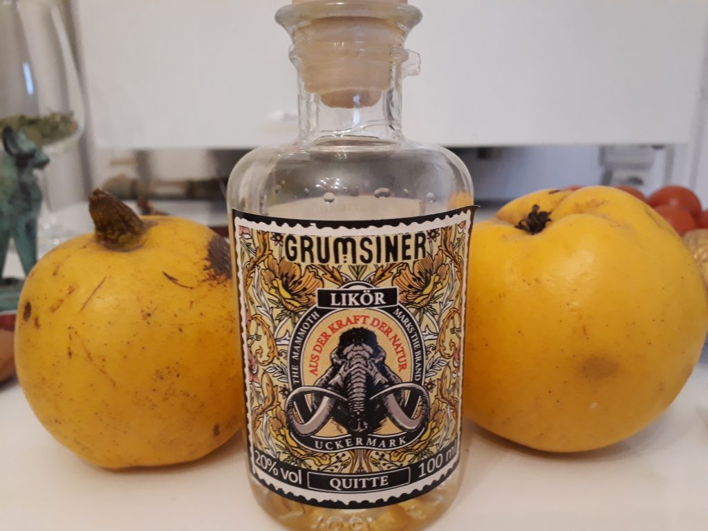 Stillleben mit Quittenlikör und Birnen-Quitten. Es gibt auch Apfelquitten, aber die sind nicht so toll, Birnenquitte geht zur Not sogar roh und ist aromatischer. Mein Lebensinhalt ist die Suche nach dem heiligen Gral aller Obstbrände, dem Quittenbrand. Vor Jahrzehnten hatte ich eine diesbezügliche Epiphanie, als ich in einem unscheinbaren Dorfgasthaus einen Quittenbrand verklappte, der in seiner strahlenden Reinheit und Klarheit mit seiner komplex süß-säuerlichen Honig-Zitronennote alle Brände dieser Welt als fuselige Randnotiz erscheinen ließ. Nichts dergleichen fand ich seitdem wieder und irre nun wie einst Parsifal, der reine Tor, auf meiner Suche nach Erlösung durch die Welt der Obstbrände. Alle Quittenbrände, die ich seitdem auch in edleren Etablissements verkostete, waren schlicht Mist, wie überhaupt gute Obstbrände jenseits dieses Schladerer Massenschrotts selten sind. Eine Annäherung an den Gral brachte jener Quittenlikör im Bild oben, der mich dazu veranlasst, Ihnen, liebe Leserinnen, einen exclusiven Einblick in meine Experimentalküche zu geben.