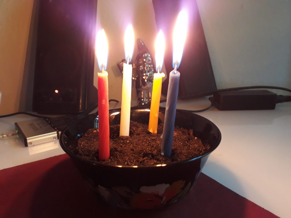 Chanukka Kerzen. Chanukka ist nicht das jüdische Weihnachten, wie manche glaubt, sondern erinnert an die Einweihung des Tempels in Jerusalem nach dem Sieg der Makkabäer über die hellenisierten Juden, also die Durchsetzung jener Variante des jüdischen Glaubens, wie wir ihn heute kennen. Ich kriege die Kerzen von der Deutsch-Israelischen Gesellschaft zugeschickt und da ich aus dem Alter des militanten Antiklerikalismus, der zusätzlich sowas von 80er Jahre ist, raus bin, lasse ich mir gerne von den Kerzen ein warmes PC-Licht im Dämmer der trüben Wintermorgen spenden. Damit die Dinger stehen, fülle ich eine Schale mit Gartenerde, siehe Foto. Beim heutigen Erdesammeln stand ich unvermittelt Aug in Aug mit einem Reiher, der über einem unserer Teiche hockte. Ein Anblick irgendwo zwischen Erhabenheit und Skurrilität.