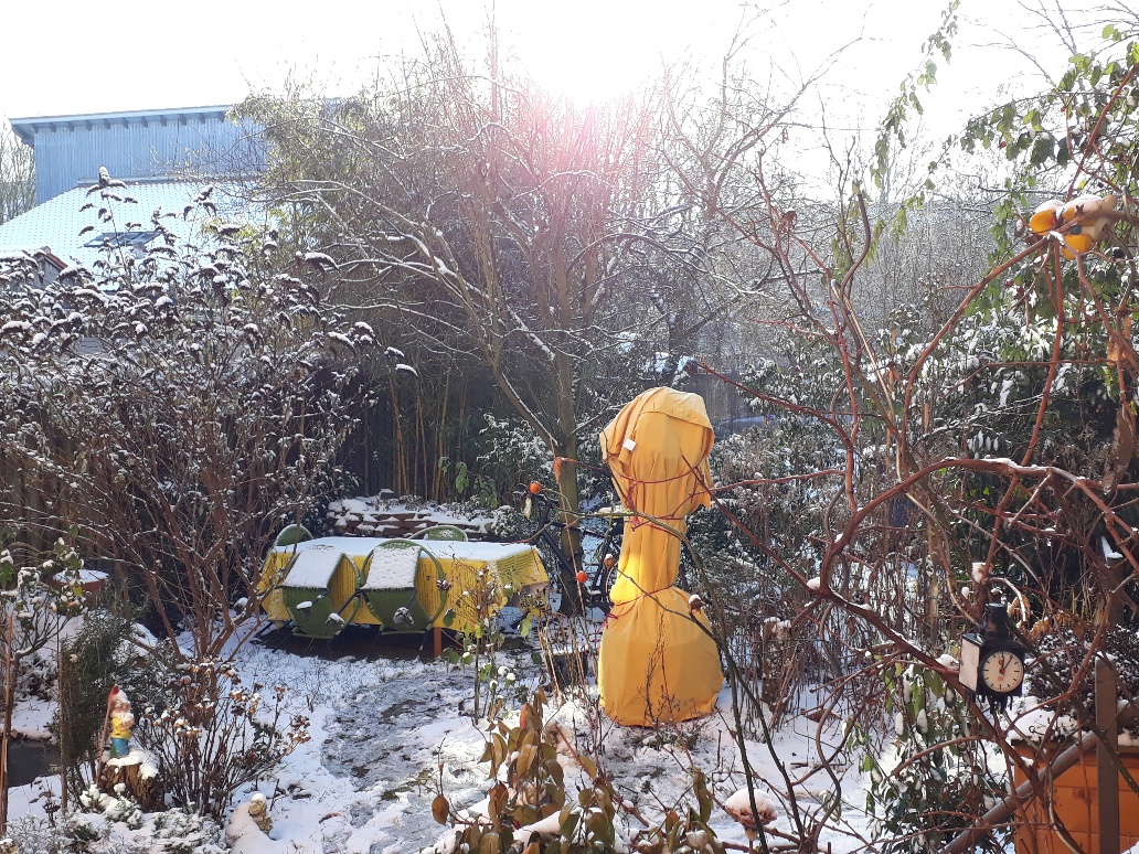 Mir fällt schwer, mich zu erinnern, wann ich das letzte Mal einen kreativen Funken hatte. Diese Christo-Verhüllung oben seht ja nett aus, kann man aber kaum als kreativ bezeichnen. Das ist lediglich Kollateralfolge einer Notwendigkeit, auf die ich verzichten kann. Die Jahre werden doch immer wärmer, was sollen dann diese Frostausreißer?!