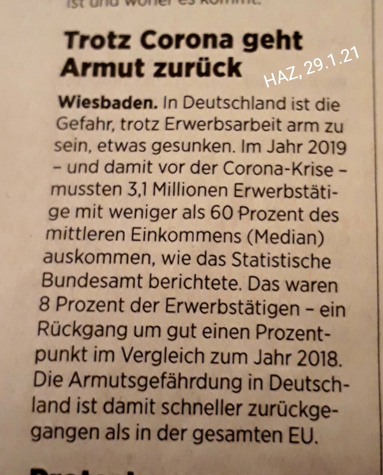 Was macht dieses Flaggschiff des Blindgänger-Journalismus, die HAZ, draus? Trotz Corona geht Armut zurück.