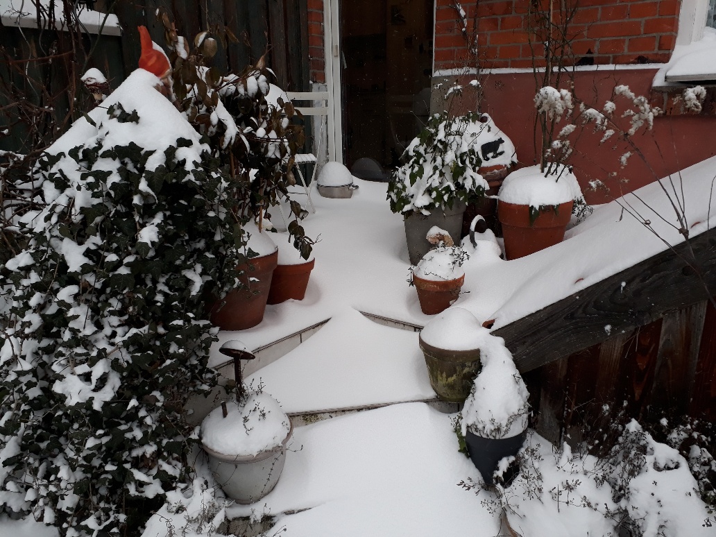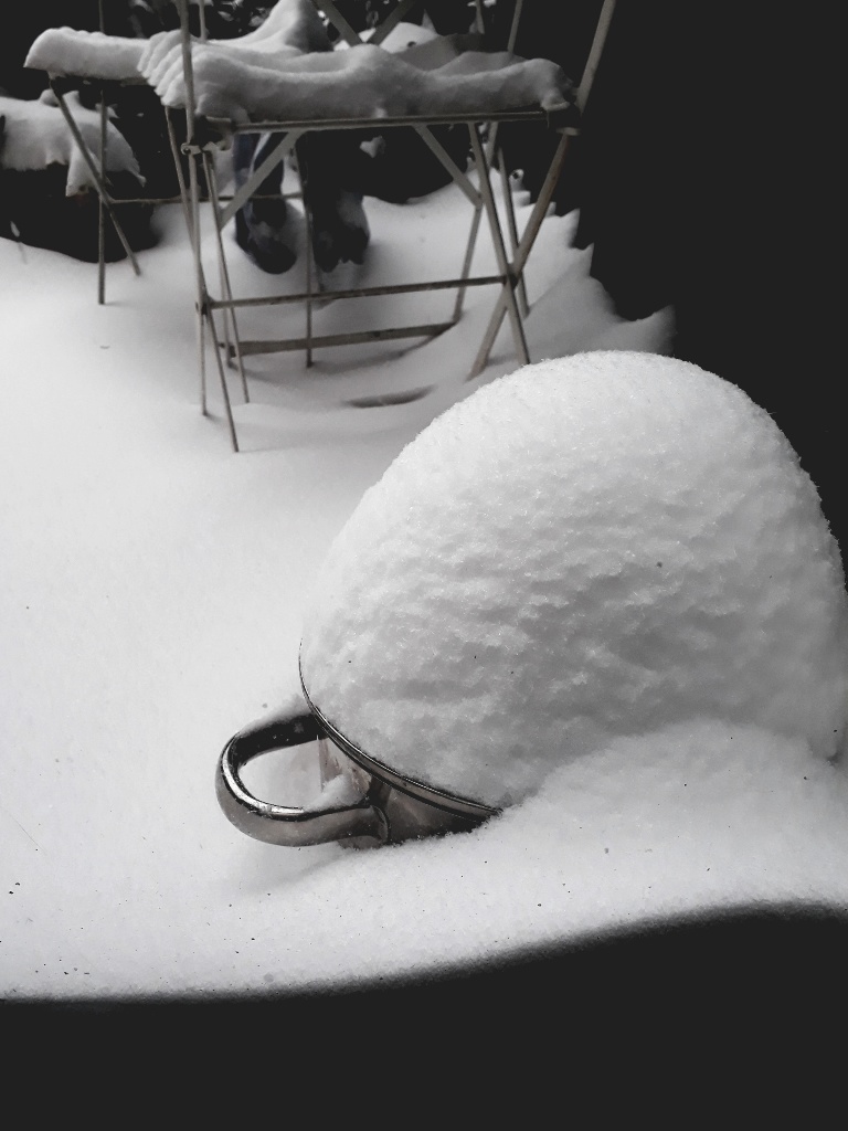 Veranda Stillleben mit zugeschneitem Suppentopf. Wohl dem, der Veranda oder Balkon besitzt, hier können alle Gegenstände geparkt werden, die man in der Wohnung, welche, egal wie groß sie ist, immer zu klein ist, nicht gelagert werden sollen, von Wäscheständern über Turnschuhen bis hin zu Sektflaschen und Lebensmitteln. Letzteres zumindest im Winter. Man muss es dann nur wiederfinden, hätte ich zwei Stunden später heute Morgen nach meinem Suppentopf geschaut, wäre er komplett unter Schnee verschwunden.