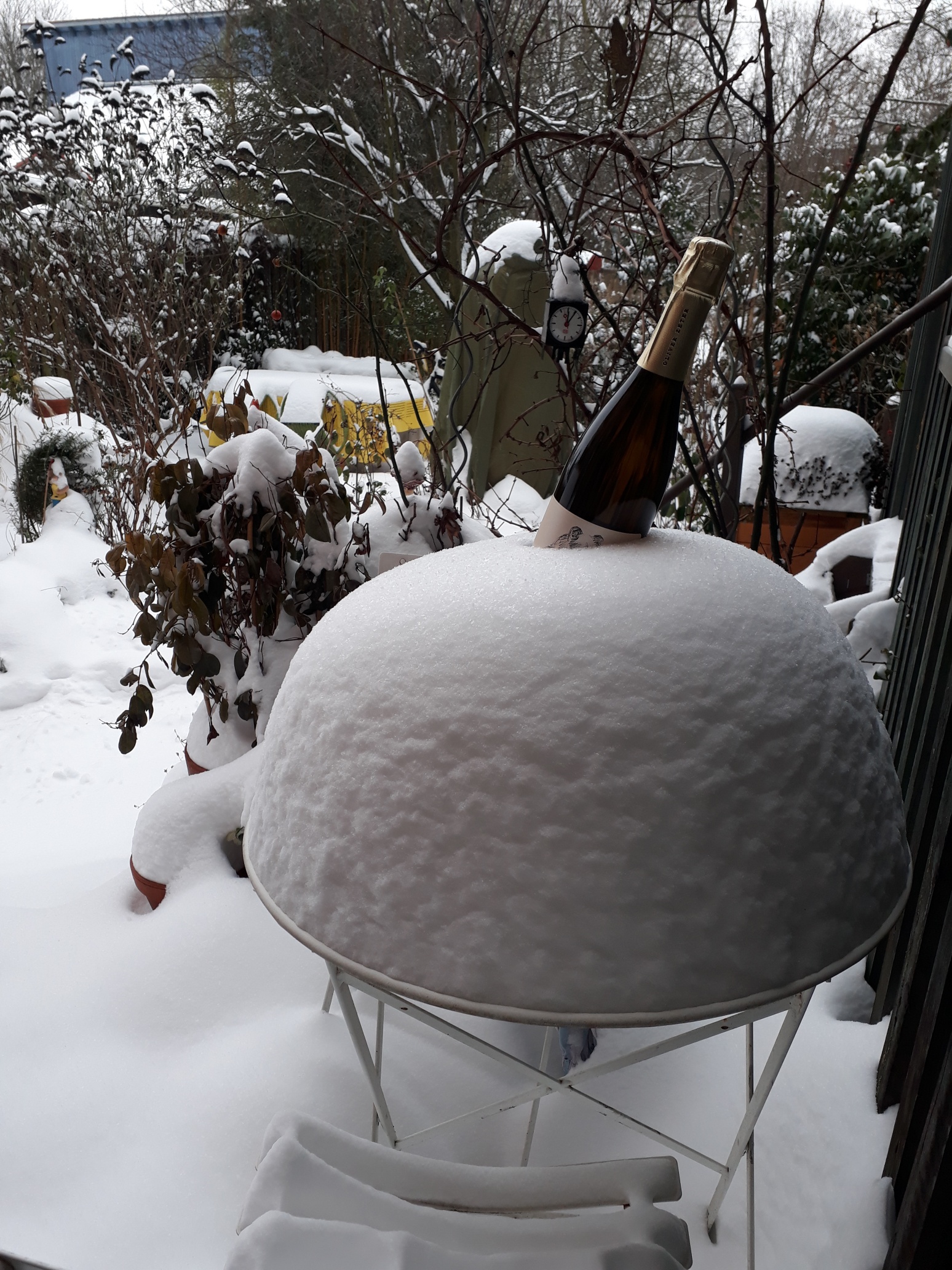 Schneehöhe Verandatisch 30 Zentimeter. Das Winterwetter hat ja auch nützliche Seiten, für zwei, drei Tage sieht die weiße Pracht im Garten ganz schön aus. Länger muss nicht sein, in der Zeit kann man ja Fotos davon machen und sie sich hinterher angucken.