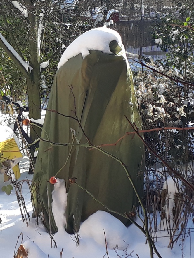 Wenn ich im Halbtran zur Morgentoilette torkele, kriege ich im morgendlichen Dunkel mitunter immer noch einen Herzinfarkt, falls mein unbebrillter Blick auf diese an Darth Vader gemahnende Skulptur im Garten fällt. Es ist aber bloß die Korfu-Olive, die einen zweiten Überzieher bekommen hat angesichts der sibirischen Fröste. Da die erste Schutzschicht zu einer Isolierung verleihenden beinharten Eisdecke gefroren ist, bin ich zuversichtlich, dass das Teil auch heuer wieder durch den Winter kommt. In südlichen Regionen werden die Blüten von Zitrusfrüchten beim selten aber doch mitunter nahendem Frost künstlich vorab beregnet, was sie im Einfrieren durch die dabei freiwerdende Kristallisationswärme vor tieferen, tödlichen Temperaturen schützt. Reisen bildet. Sowas wäre eine prima Frage für ein TV Quiz: Wie werden die Blüten von Zitrusfrüchten in südlichen Ländern vor dem Erfrieren bewahrt? 1. Durch Heizpilze 2. Durch Decken 3. Durch Wärme von Schafherden 4. Durch Kristallisationswärme. Da tippen 90 Prozent auf Heizpilze, jede Wette. Aber ich sehe es schon kommen, dass die entscheidende Frage beim nächste TV Quiz lautet: Wer hat den Käse zum Bahnhof gerollt? 1. Prinz Frederick 2. Prinz August 3. Prinzessin Viktoria 4. Königin Sommerlatte. Letztere konnte ich mir merken, weiß auch nicht wieso.